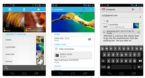 A new People app is included in the basic Ice Cream Sandwich build which allows social groups, profiles, and contacts to be linked together in one place. This is the first integrated app in the Android system to include workability with Google+ outside the Google+ app itself. You have your own "Me" profile here including all of your contacts (pulled from one phone to another with ease since they're now connected to your profile, not your device), each profile photo tapped displays Quick Contacts, shortcuts to phone numbers and text messaging, and elements inside social networks.
