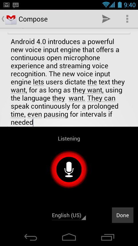Right inside the keyboard is the microphone which leads the user into the updated voice input engine. There's now an "open microphone" experience that features streaming voice recognition. Users can speak at length and have the test typed, complete with spaces, punctuation, and smily faces.