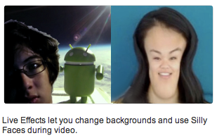 Live Effects is a separate app built-in to Ice Cream Sandwich that allows users to edit video. You can change the background behind a subject in a video you've already made OR affect the way you're seen in a video chat with Google Talk! You can also of course use things like Silly Faces which uses similar tech to what's being used at the lock screen for facial recognition aside GPU filters that add effects to the face during video capture. Squish that face!