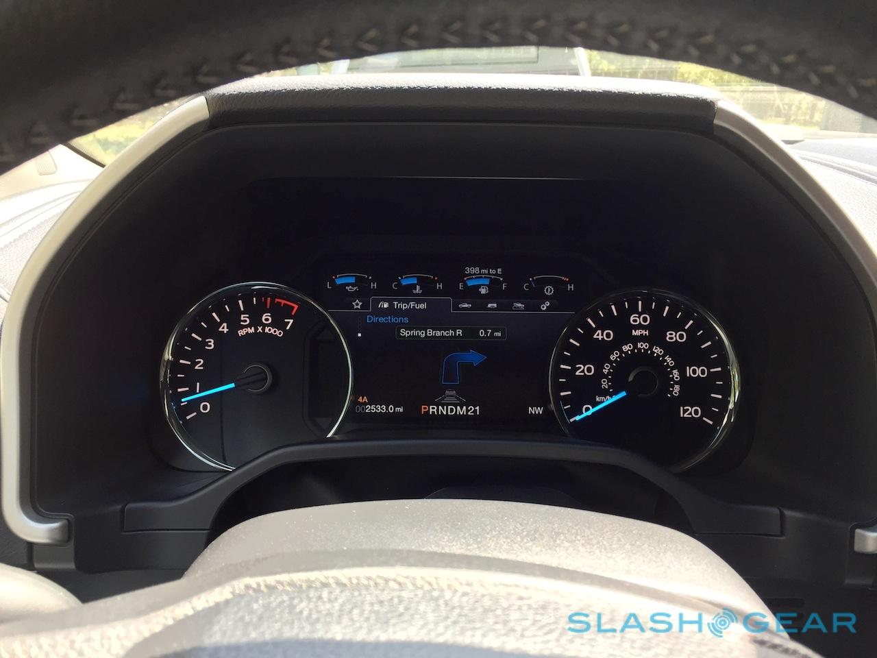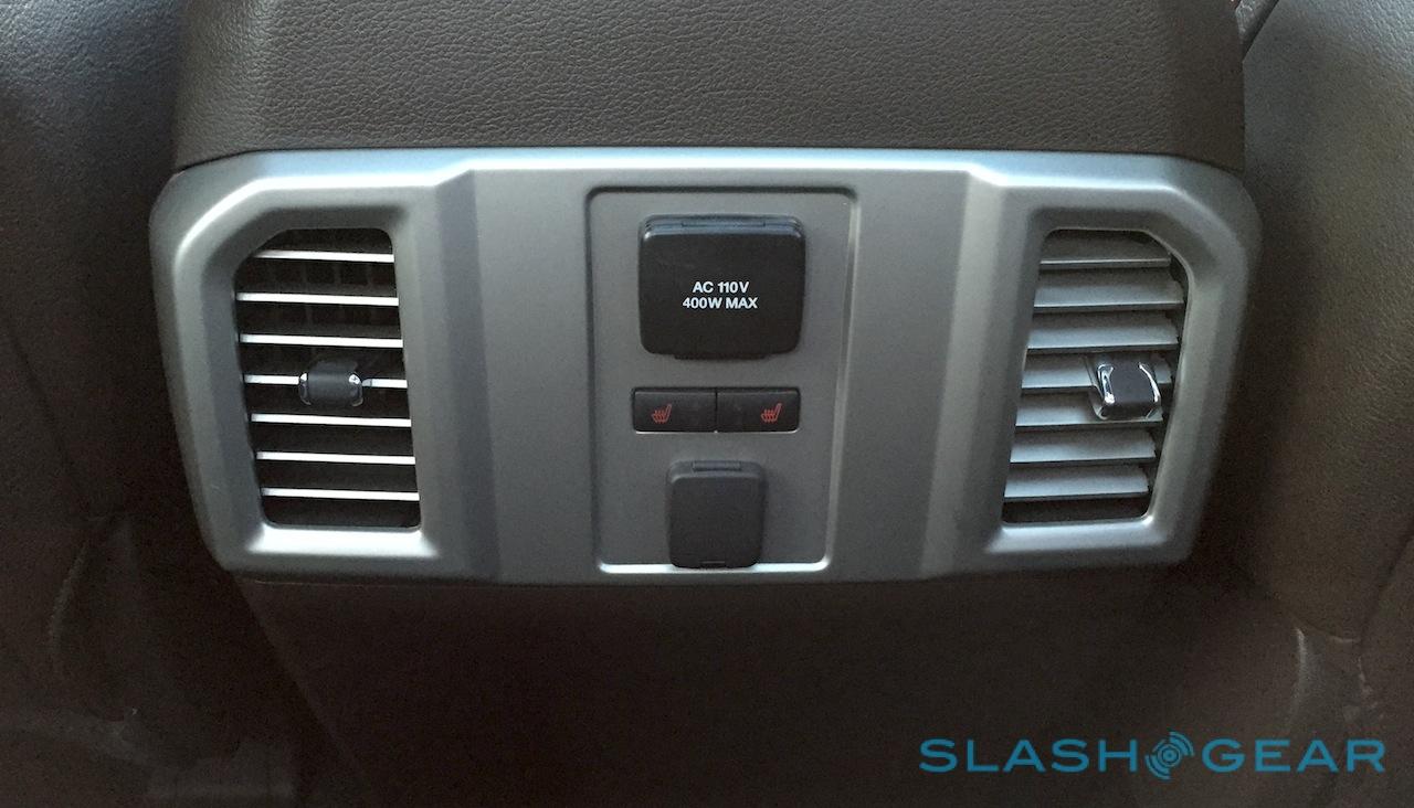 Nonetheless, there are several features we found ourself wishing all cars would come with, like two full 110V outlets – one in the dash, one at the rear – which get a 400W inverter (300W while driving) so that they can not only charge phones and tablets, but run a flatscreen TV or charge your power tools. The optional 8-inch display sandwiched between the analog dials in the driver binnacle is clear and crisp, topping several panes of vehicle information with a row of customizable virtual gages.