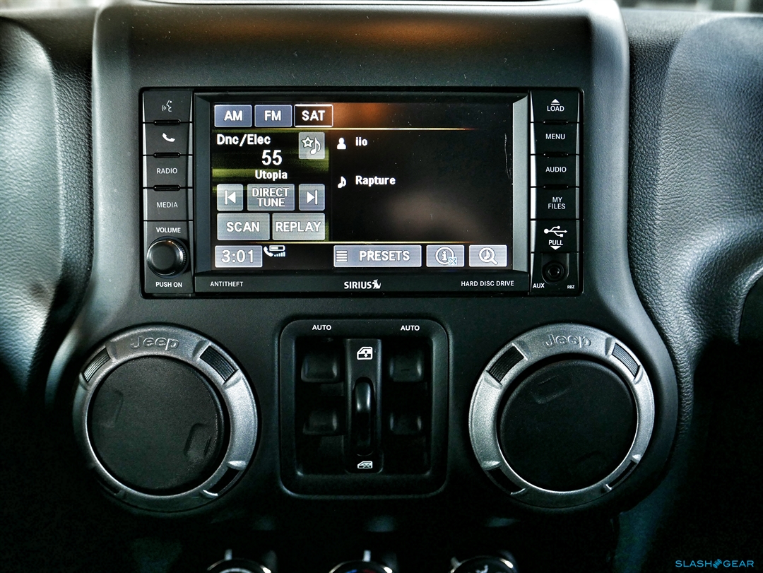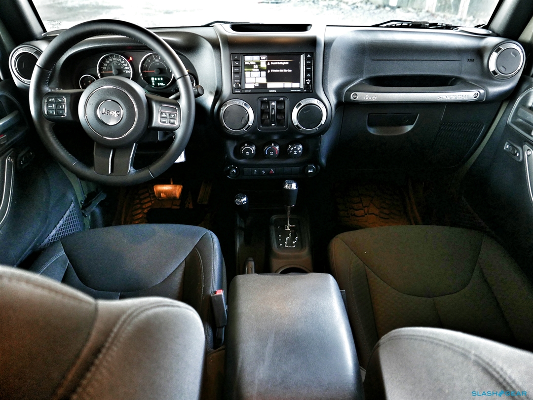 Inside, simplicity reigns. The Wrangler Unlimited that I piloted was outfitted with the most basic version of the Uconnect touchscreen infotainment interface available, a functional but unspectacular setup that trails the competition (and indeed the much more advanced Uconnect systems available in other Jeep products). Since the doors, roof, and windshield can all be removed from the vehicle, instrumentation and switchgear is concentrated on the dashboard, and door cards are plain and functional (my Willys Wheeler was actually a 'W' model which denoted air conditioning and power windows).