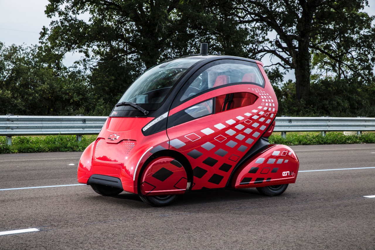 GM demonstrated an early iteration of the technology in the new Chevrolet Electric Networked-Vehicle (EN-V) 2.0, the second-generation version of the company's concept "pod" car for the city. The four-wheel drive microcar mixes together data from cameras, LIDAR and V2X for low-speed autonomous driving, all on electric power.