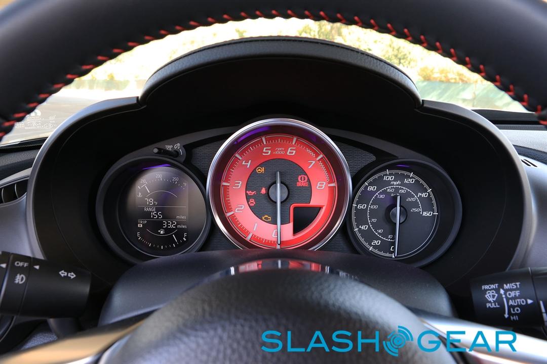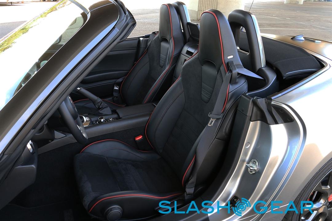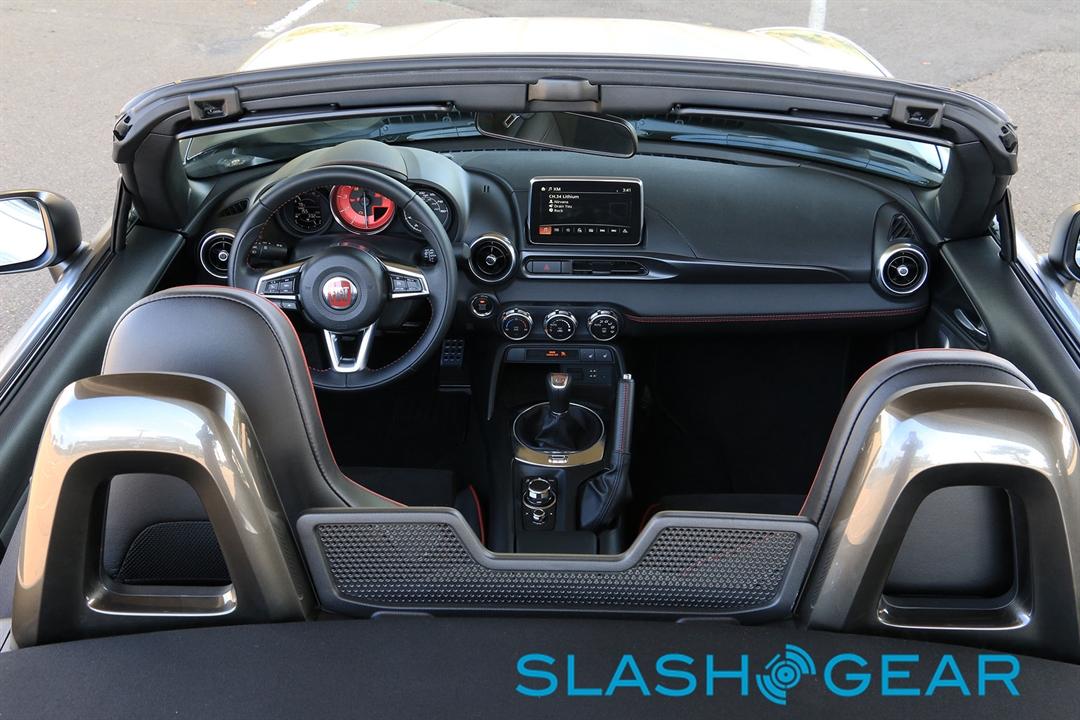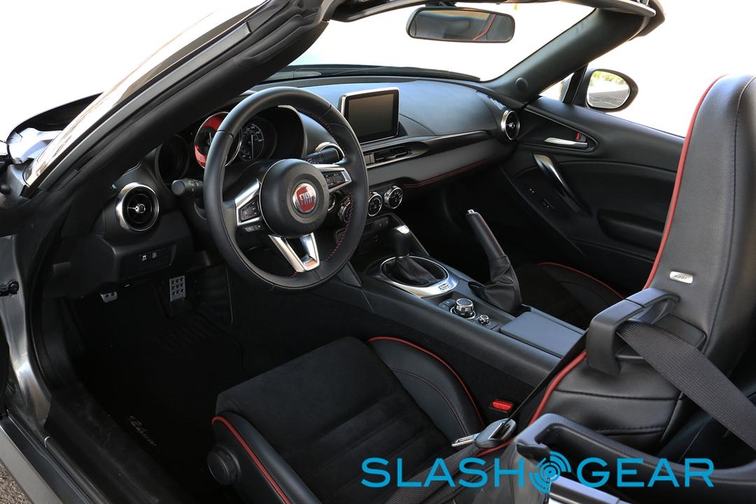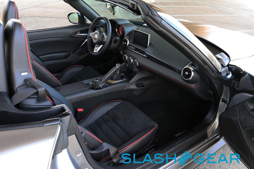 Inside the resemblance between the two cars is more obvious, as the cabin layout and switchgear are essentially identical. But 124 Spider offers some European flare by way of Fiat-sourced gauges, material options, and internal seat construction.
