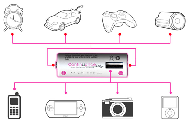 When my son was born, and his vibrating bouncy seat started eating through AA batteries like jelly beans, I bought rechargeable batteries. But I found them kind of a pain. They didn't always charge back up very well, and it took a long time to charge them. Therefore, the battery charger is now in a drawer, and while we still go through AAs like crazy for all those electronic toys, I just buy regular batteries. But if this concept design comes to light, I might just switch back. Continuance is a battery with a USB port right in the side.
