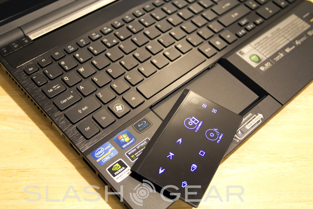 The trackpad has a nice smooth finish with a satin sheen that helps prevent fingerprint smudges. It can be removed with the push of a latch and used as a remote control. It's completely black, save for a small blue LED indicator light and a slightly indented button area, but once the button is pressed, backlit media control touch icons appear, including play/pause, forward, backward, volume, as well as Video and Music launchers. It's really convenient, but also seems easy to lose.