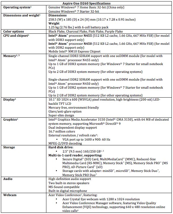The Aspire One D260 is equipped with the new Intel® Atom™ N455/N450 processor, Mobile Intel® NM10 Express Chipset and can integrate up to 2 GB of DDR3[1] memory. Intel® Graphics Media Accelerator 3150, with 64 MB of dedicated system memory, supporting Microsoft® DirectX® 9, guarantees superb graphic performance. Notwithstanding its compact size, it houses a large internal hard disk with up to 250 GB of capacity and a built-in multi-in-one card reader for more convenient storage options and file sharing.