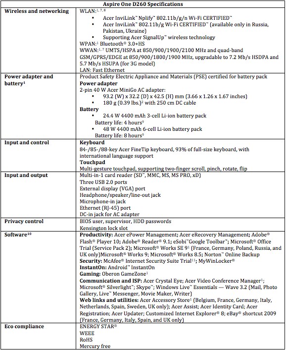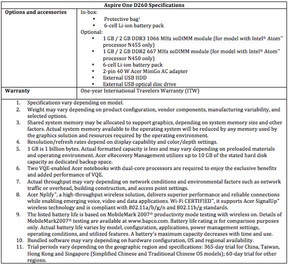 With a single charge you get up to 8 hours cable free power so you can email, chat, blog or surf as much as you want and get the most while you are on the go. A real globetrotter, the Aspire One D260 comes with the innovative Acer MiniGo adapter that has a wall mount design, is 34% lighter than typical adapters, and saves 1/3 charging time. What's more, it comes with optional interchangeable AC converters, so you will always have the right plug.