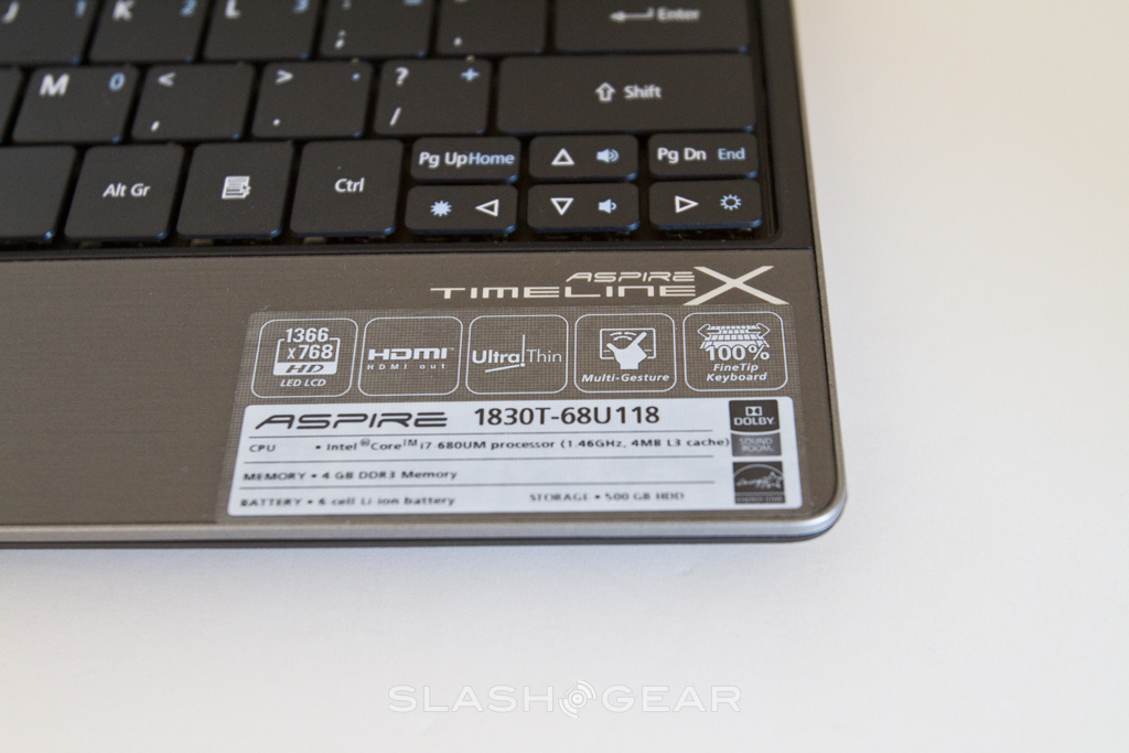 Where once a machine like this would've used a mere CULV processor, the TimelineX AS1830T-68U118 squeezes in one of Intel's latest ultra-low voltage chips, specifically the Core i7-680UM dual-core running at 1.46GHz. It's paired with 4GB of DDR3 memory and a 500GB 5,400rpm hard-drive, together with Intel HD graphics (with 128MB of dedicated system memory).