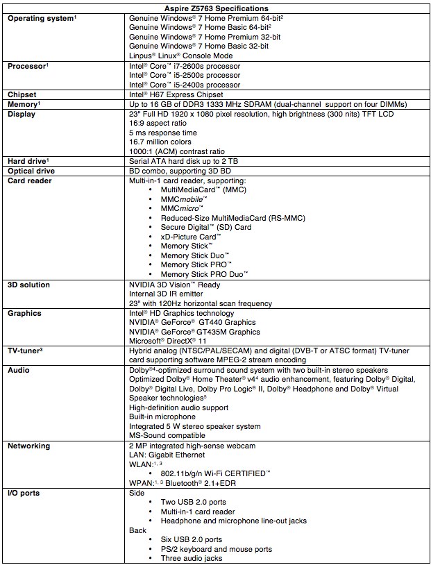 Acer has outed its latest all-in-one PC, and this time there's 3D in the mixture as well. The Acer Aspire Z5763 has a 23-inch 1920 x 1080 display and uses NVIDIA 3D Vision with an integrated emitter for the active shutter glasses; inside there's a choice of Intel Core i5-2400s, i5-2500s or i7-2600s CPUs along with Intel HD Graphics, NVIDIA GeForce GT440 or the GeForce GT435M.