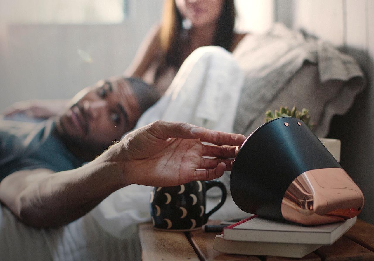 Control is boiled down to a single multi-function button in the center of the speaker grille, and a rotating ring around its edge. Turning the dial starts playback, with a subsequent turn changing the source; tapping the center pauses playback.