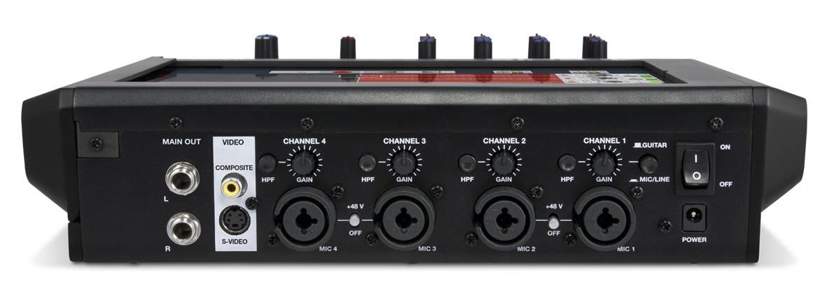 Ports include four XLR-1/4" inputs with optional 48V phantom power for studio condenser microphones – while channel one is also switchable to guitar-direct input – as well as two 1/4" TRS balanced outputs, a 1/4" TRS stereo headphone socket, and an RCA composite video output. The iPad itself slides into a dock section and is locked in place for stability; it's recharged by the same power supply that's keeping the iO Mix running.