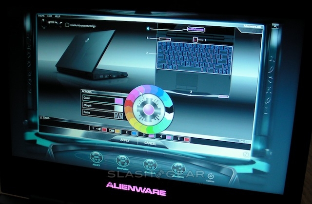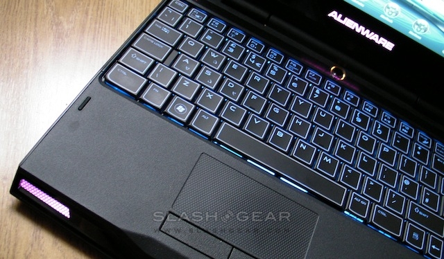 As for the trackpad, that's a discrete textured square with tactile buttons underneath it. The standard Synaptics multitouch gestures – such as two-finger scrolling and pinch-zoom – are turned off by default. If it's easy to miss the pad, that's because of Alienware's LED lighting effects. The entire keyboard is backlit, as is the Alienware logo (both the text under the display and the Alien-head power button), the status indicators on the top left of the 'board, and the two grills inset into the front edge of the notebook. A manager app called AlienFX is preloaded, from which you can independently set each color from a wheel of different hues, before saving it as an overall color scheme. It's also possible to choose two different schemes to automatically load depending on whether the M11x is on mains or battery power. It's perhaps a little gimmicky, but it does lift the otherwise somber gloss-black finish of our review unit.