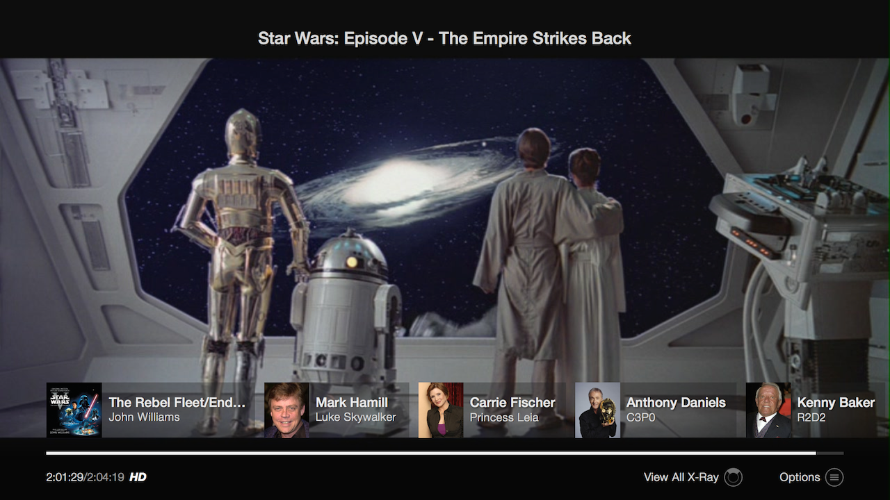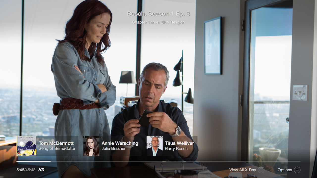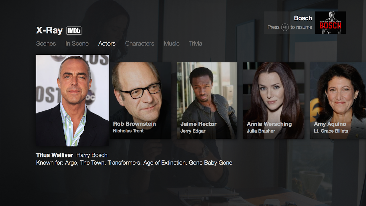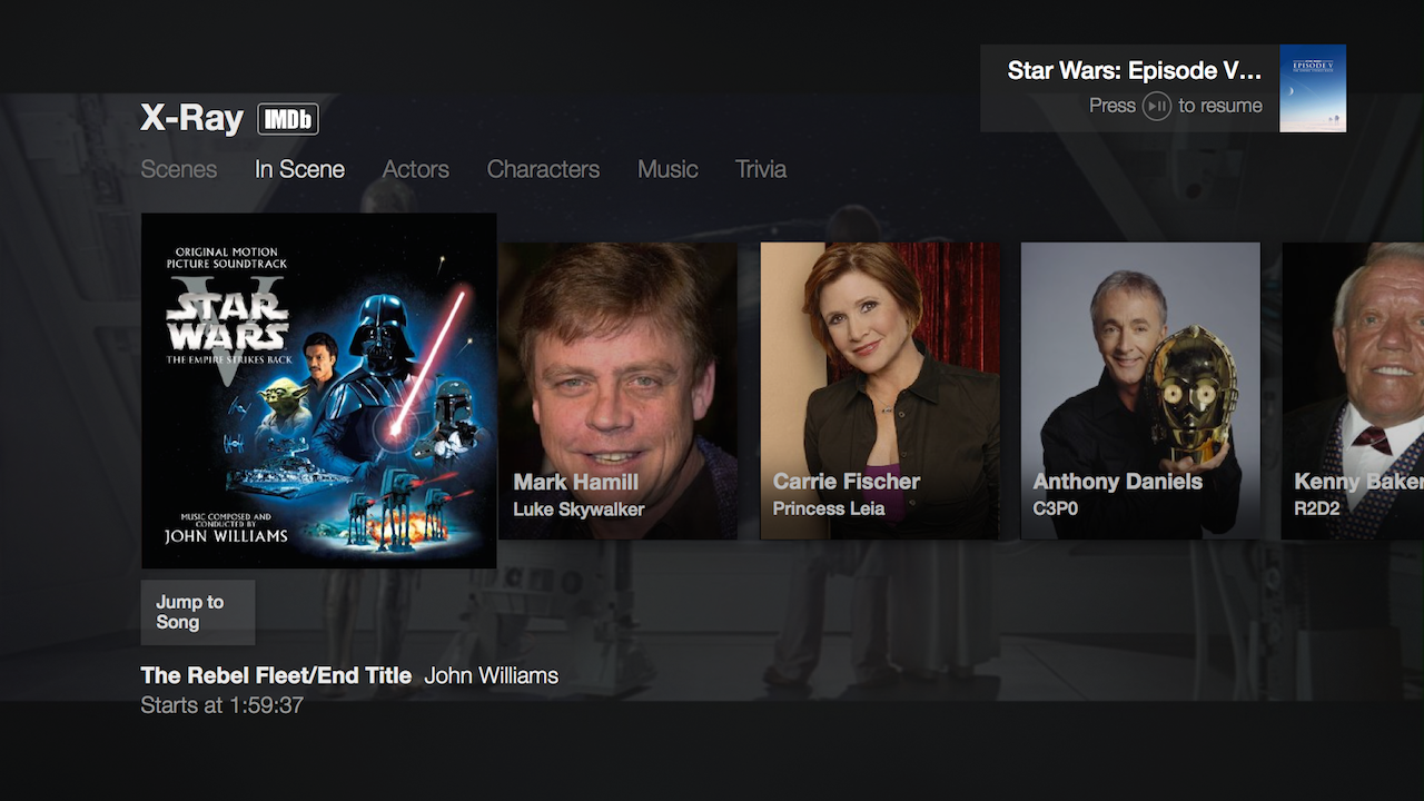 Then, you get the familiar X-Ray interface, split into scenes overall, who's featuring in the current scene, and all of the actors in the movie or TV show. A list of all the music featured is accessible too, as is trivia from IMDB.