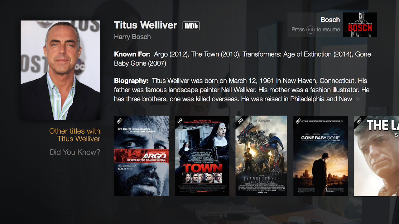 That's designed to answer immediate questions without requiring that the movie itself be paused, Amazon explained to me when I previewed the system ahead of today's launch. If you still have questions, however, there's more information accessed by pressing "up" again.