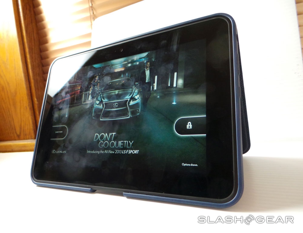 There's also a rather nice case/cover that you'll probably want to pick up from Amazon if/when you purchase the Kindle Fire HD 8.9. It's made by Amazon and looks like what you're seeing above, complete with a magnetic "smart" off/on function (as the Kindle Fire HD 8.9 does indeed have that sensor) and has a rubbery bumper that allows it to stand up like you're seeing here too.