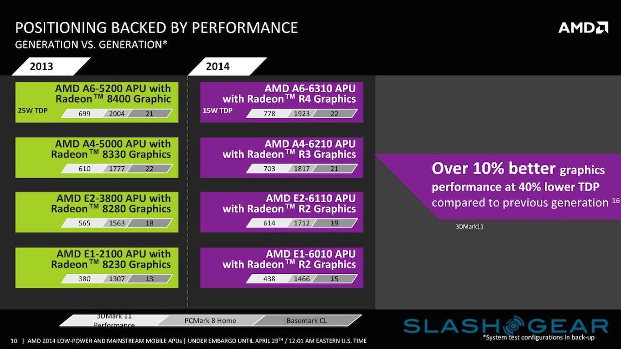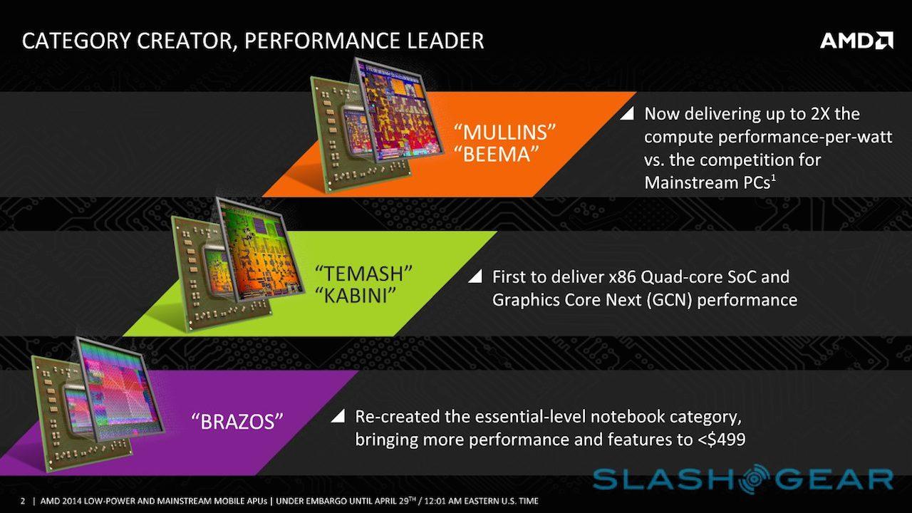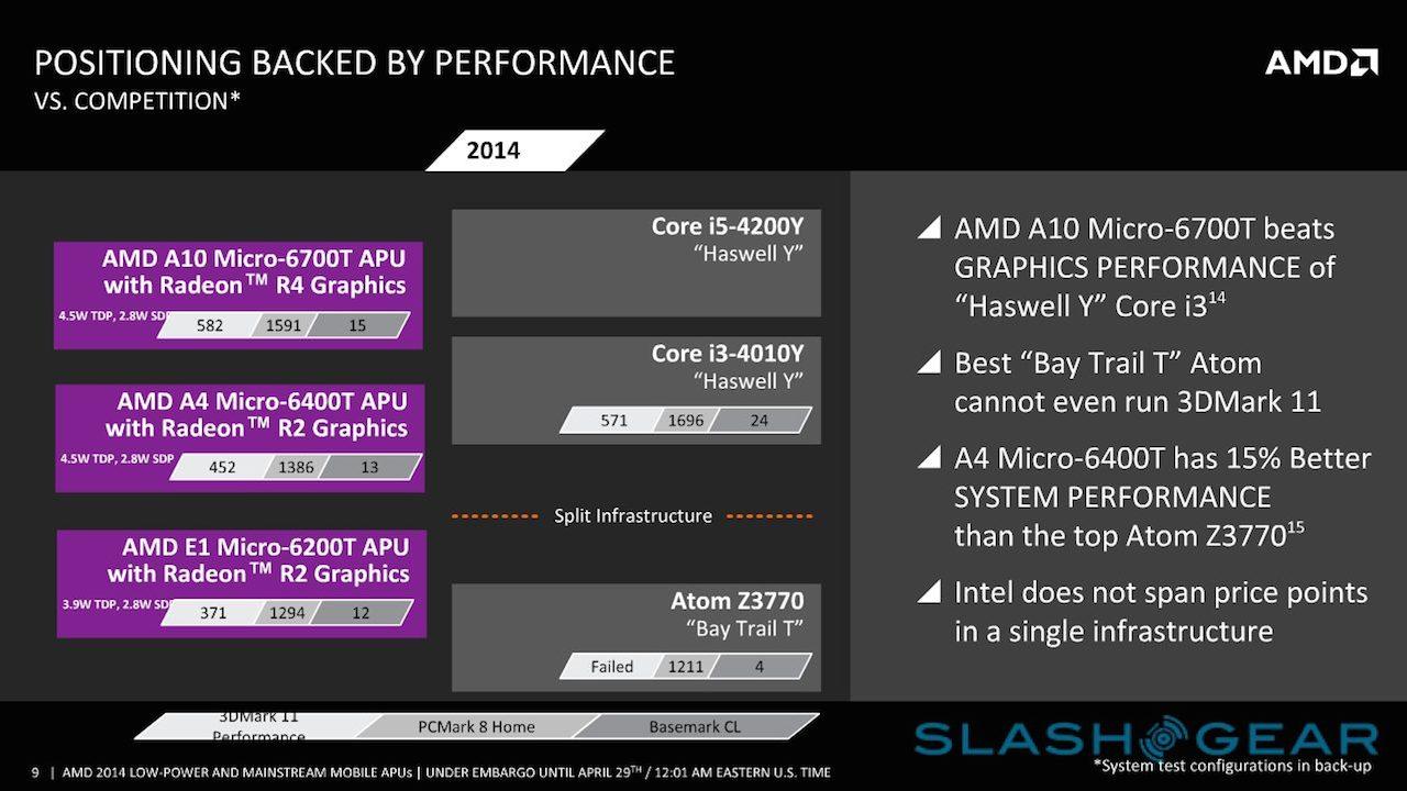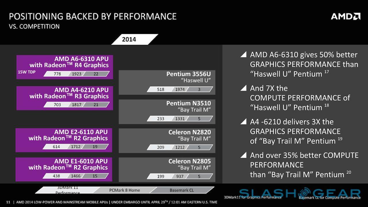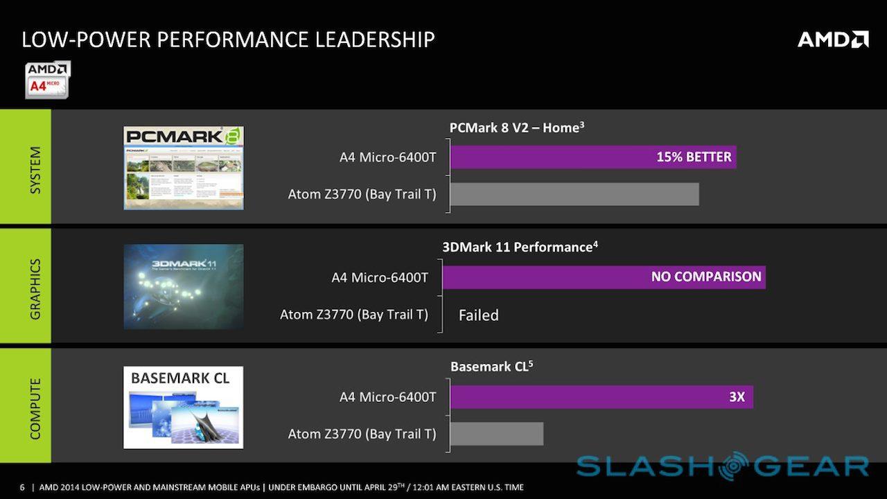 That, AMD claims, makes them three times more powerful in compute than Intel's corresponding Atom processors, and offers better graphics performance than a Core i3.