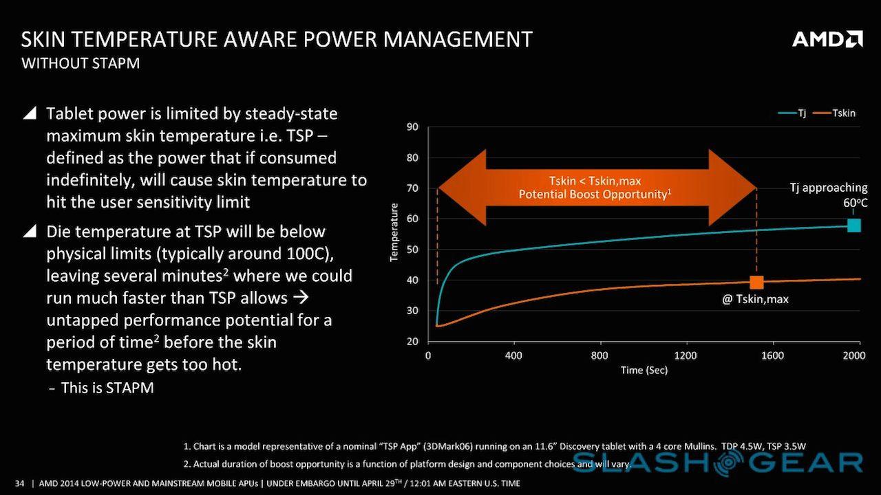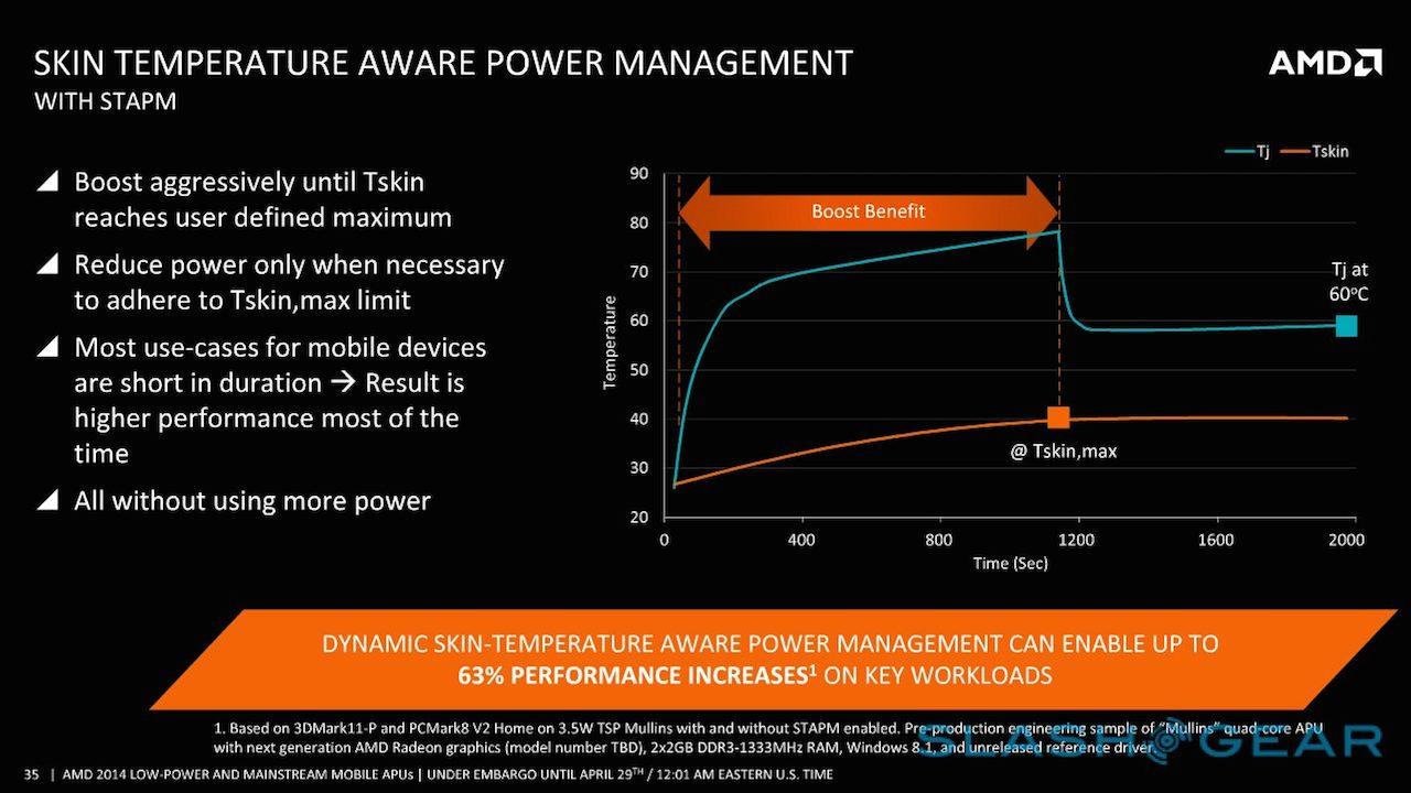 Only certain apps will kick Intelligent Boost into action, then, and AMD also uses what it's calling "skin temperature aware power management" that relies on the expected comfort around heat of the person holding the device to decide how long overclocking can go on for. AMD even suggests that this rapid cycling of power modes will prolong battery life, since the rest of the system can quickly go back to sleep when the boosted processor has more swiftly done its crunching.