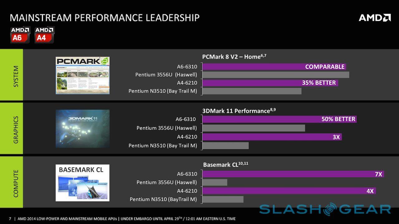 AMD says the Mainstream chips cut power by 20-percent over their predecessors, despite as much as doubling graphics performance; compared to Intel's range, there's up to a 50-percent better showing in graphics, and up to 7x the compute performance, versus a "Haswell U" Pentium chip.
