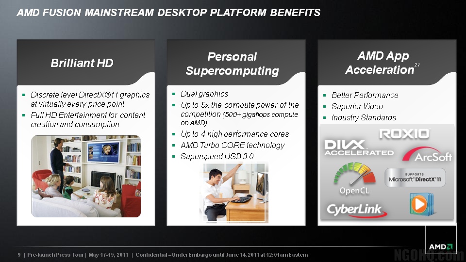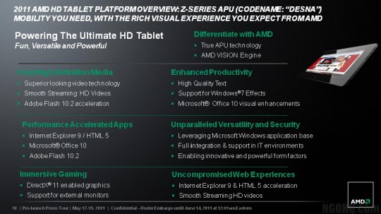 Building on top of this for their tablet chip offering should yield some pretty awesome results. According to the roadmap, their new chipset will be a Fusion Z-Series codenamed "Desna." These chips will support DirectX 11 graphics, Adobe Flash Player video acceleration, and smooth HD video streaming. They will also support hardware graphics acceleration for Internet Explorer 9, Microsoft Office 10, and Windows 7 visual effects.