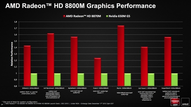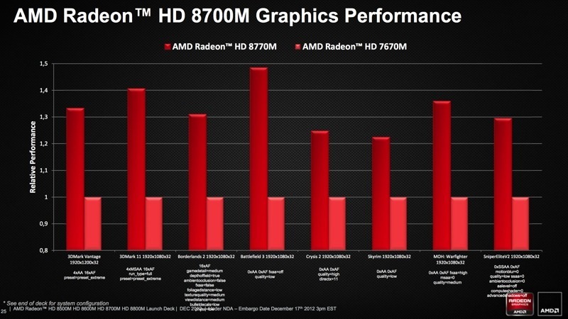 Of course, AMD has shared plenty of promotional material on the series, putting some of the cards in the line against its competitors in a series of graphs. AMD put the Radeon HD 8870M up against the NVIDIA GeForce 650M, running a number of benchmarks and testing them out with a handful of games. In these tests, the 8870M outperformed the 650M by 20-70%, though there were some details missing from these graphs, such as frame rate. We'll have to wait until the cards get closer to release for more juicy details.