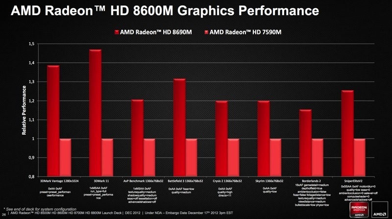 We're looking at four different chips being announced today: the 8500M, the 8600M, the 8700M, and finally, the 8800M. These cards will cover the performance + gaming and mainstream segments of AMD's audience as we head into 2013, with a new series being announced in Q2 2013 for the enthusiasts among us. The first computers using the 8000M series will begin popping up on store shelves in Q1 2013, so it won't be long before we start seeing these cards in laptops.