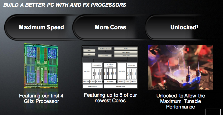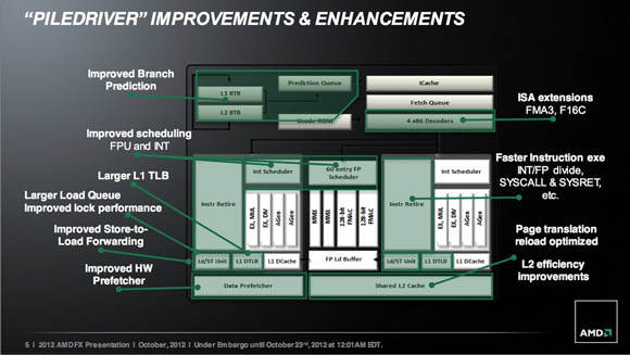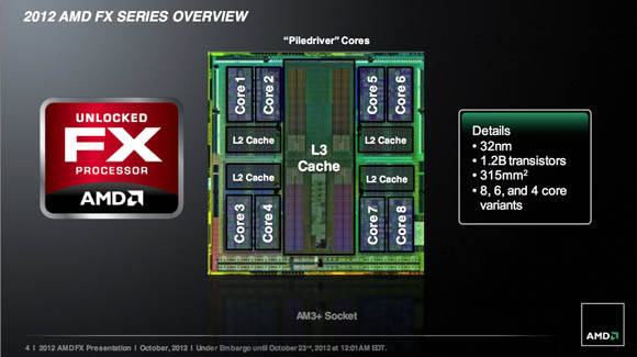 The Piledriver cores were first introduced back in May in the A Series Trinity chips. Improvements include improved scheduling, larger L1 TLB, larger load queue, page translation reload optimization, and more. Said Adam Kozak, "We're seeing anywhere from seven, all the way up to 15% [in improvement improvement]. Half of that comes from [instructions per cycle] improvements, and the other half or so comes from frequency improvements." According to AMD, you need a 9-series motherboard to run the FX Vishera chips.