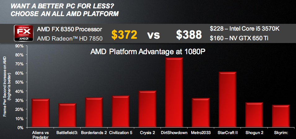 During a pre-release presentation, these four AMD processors were compared to Intel's Core i5-3570K, i5-3450, i5-2300, and i3-2120 processors. In each case, the AMD processor was priced lower and offered better specs, according to AMD's presentation of the ecosystem. All FX Series processors are unlocked and can be overclocked.
