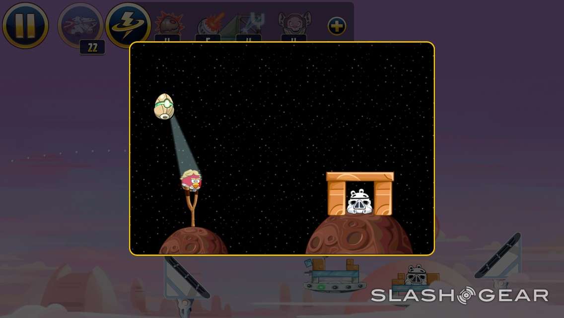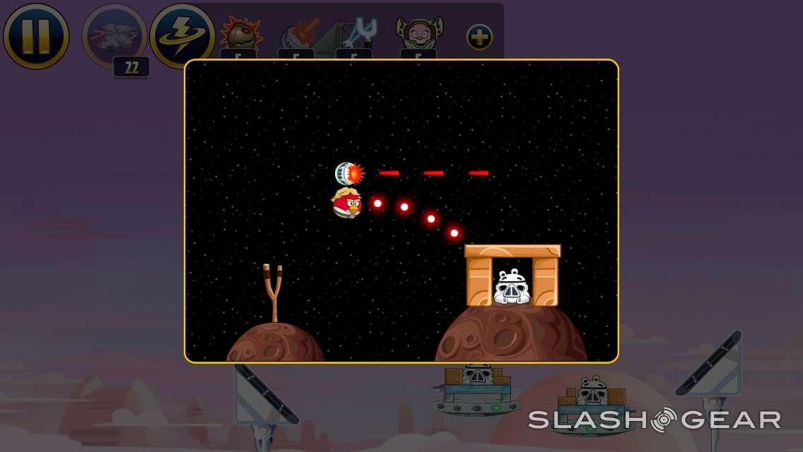 Angry Birds Star Wars continues the ways of Rovio's lucrative in-game purchase model with a series of power-ups that are also sent out free for those that play the game quite often. When a user starts up this update of the game, a spin-wheel will appear, giving the user a set of new weapons to use with any bird they choose.