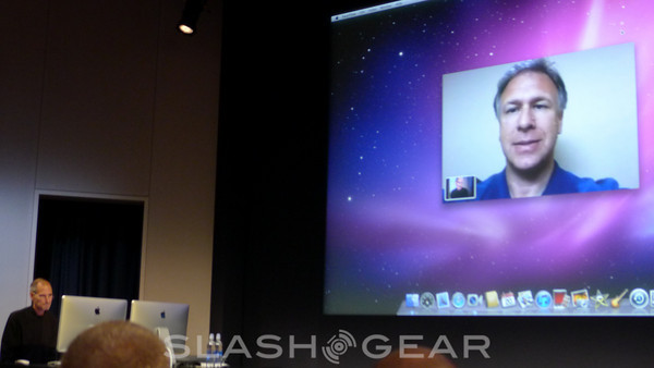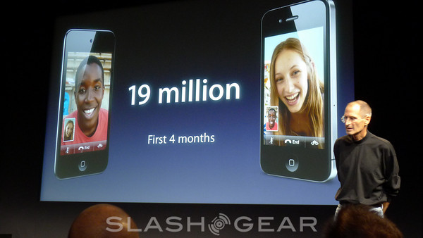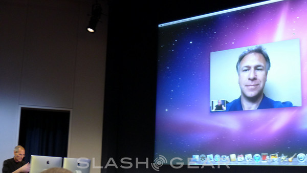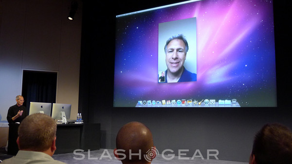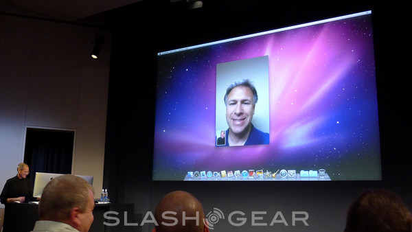 Apple announces FaceTime, the first video calling on mobile devices. 19 million Facetime devices shipped in the first 4 months they've been out. Not only can you use FaceTime on these mobile devices now, you can use them on your laptop or desktop. Fullscreen or tiny screen, Steve Jobs is so excited about it he demos it himself. He speaks with Phil Schiller, who spoke earlier in the presentation. He's on an iPhone 4, while Steve is on an iMac. Easily switching between landscape and portrait, it seems supremely easy to use. Clarity and simplicity.