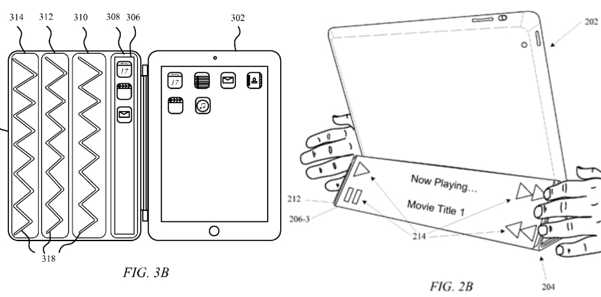 Apple is working on making the iPad Smart Cover live up to its billing, considering fitting a flexible display and touch-input system to the case according to a newly published patent filing. The concept would turn at least one of the spines of the Smart Cover into a display strip, used to expand the working space of the tablet's screen and potentially including touch-sensitive controls to navigate media playback and other features without interrupting the currently active app.