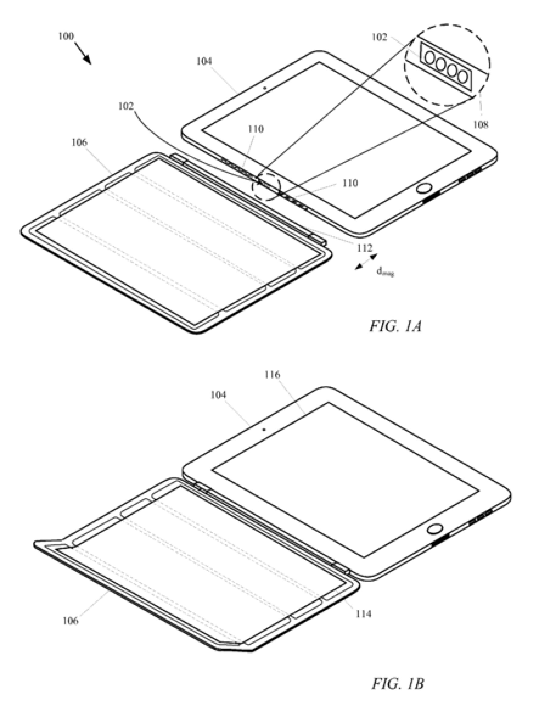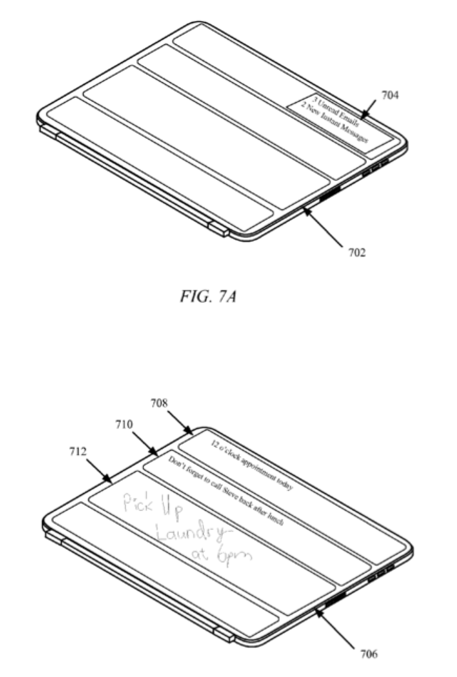 The new Smart Cover would attach via magnets as now, but also include a data and power connection similar to the MagSafe socket on MacBook computers. Apple's application explores various combinations of functionality, from a single strip to all four of the panels being digitally-enabled.