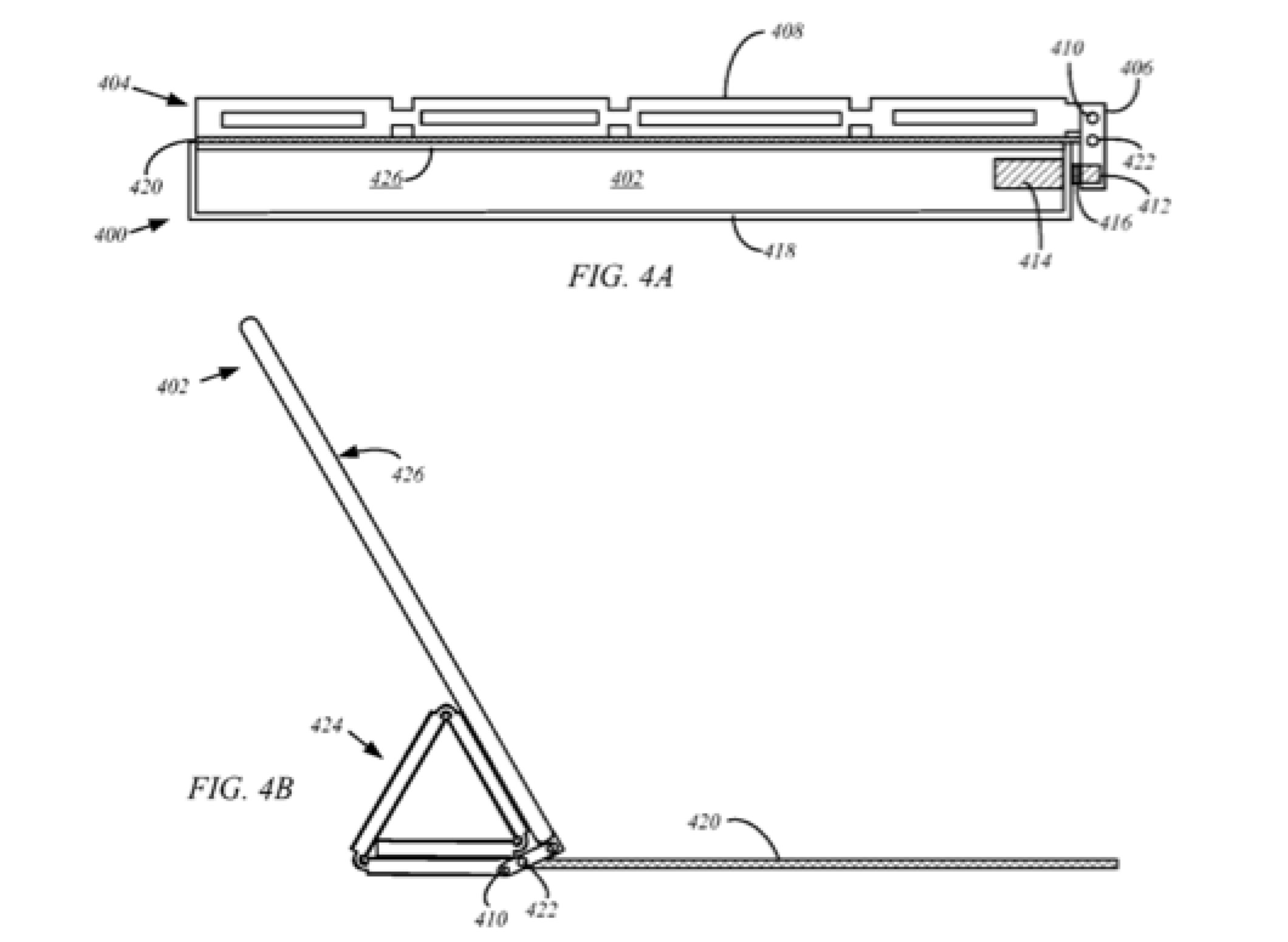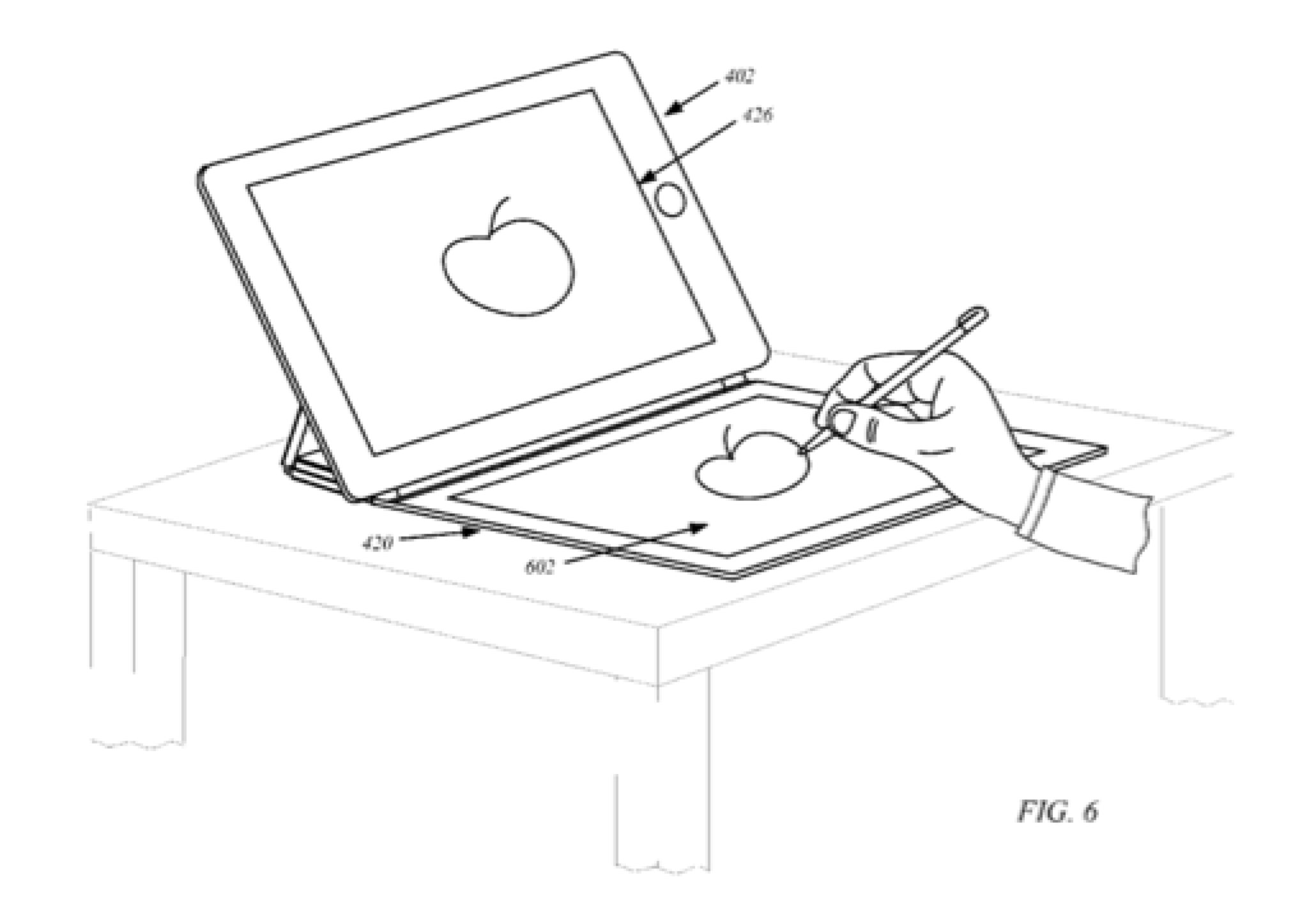 Alternatively, the whole inner panel could respond to touch input, turning it into a digital sketchpad of sorts. Those panels might not actually flex to hold the iPad upright, instead having a stiffened keyboard section and a separate folding element to prop the tablet up at a more usable angle.