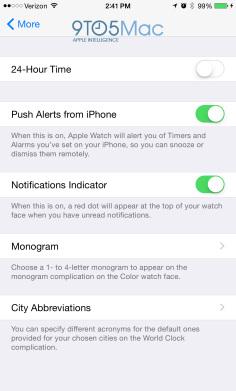The app, which has been shown to 9to5Mac, shows off many of the settings you can walk your Apple Watch through. You can chose to have alerts from your iPhone pushed to your Apple Watch, and the watch itself will have the red unread notification icon on the top right, if you choose.