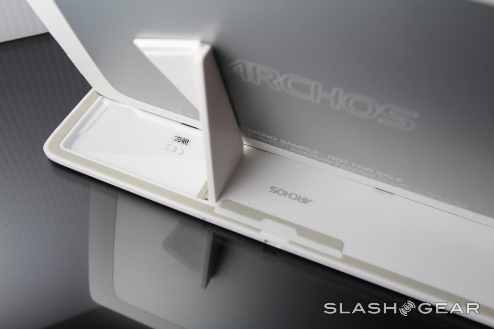 Archos lets us know that this tablet is 21 ounces light and 0.31" thin, quite small by any tablet's standards. The Coverboard adds 0.2" of thickness and holds tight with magnets to the tablet when you're ready to put it in your backpack. The Coverboard also has a strange combination of power abilities: when the tablet is docked and the dock is plugged in to the wall, the dock will charge the tablet. When the dock is not plugged in, however, the tablet will charge the dock. Strange stuff!