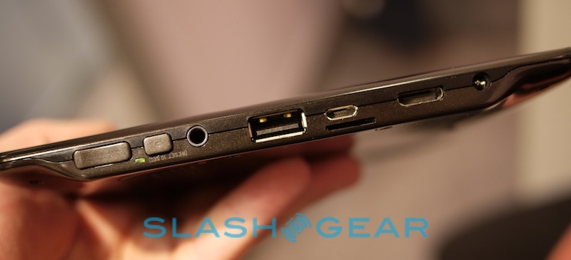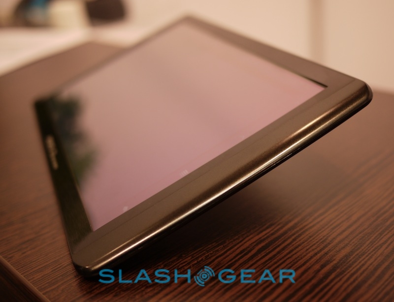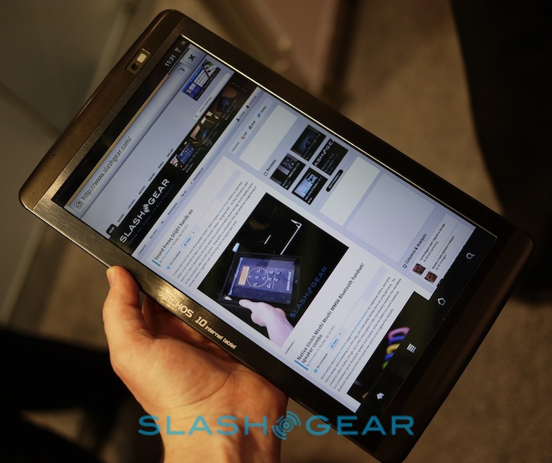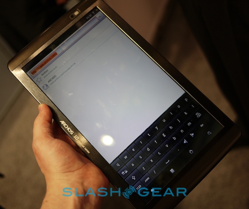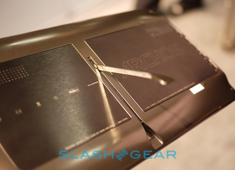 The Archos 101 is an interesting beast; at 12mm thick, it's very flat and, at 480 grams, surprising light, though the French company's choice of plastics mean it doesn't feel cheap. It also doesn't flex as you hold it, and there's a two-position kickstand on the back: first, it props it up for video viewing; second, it lowers the angle for more comfortable on-screen typing. Archos demonstrated a number of games on the slate, and the CPU could certainly keep up, using the accelerometer to navigate in racing titles.