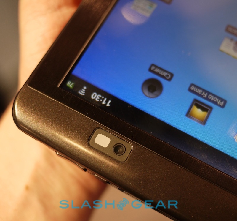 As for the Archos 70, that's a more pocketable model, measuring in at 201 x 114 x 10/14 mm (the 250GB hard-drive unit is thicker than the 8GB flash version); that makes it longer but narrower than the Galaxy Tab, with the Samsung slate slotting in-between in terms of thickness. The touchscreen felt more responsive than that of the Archos 101, though things like webpage rendering and pinch-zooming weren't as slick as on the Samsung. The Archos 70 lacks the two-stage kickstand, too, only having a single arm for video viewing. Unfortunately, there's no rear camera on either model, only the VGA webcam.