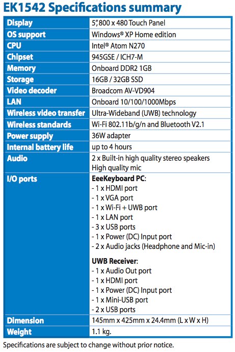 Other specs fall broadly in-line with what we've heard previously, which means a 1.6GHz Intel Atom N270 processor, 1GB of RAM, either 16GB or 32GB of SSD storage and both WiFi b/g/n and Bluetooth 2.1. Onboard ports include HDMI, VGA, WiFi/UWB antenna (with an included antenna dongle), three USB and audio in/out; it also has integrated stereo speakers and a microphone. Control is via the QWERTY keyboard itself and a 5-inch 800 x 480 touchscreen; there's also a Broadcom AV-VD904 chipset which allows the Eee Keyboard to output high-definition video.