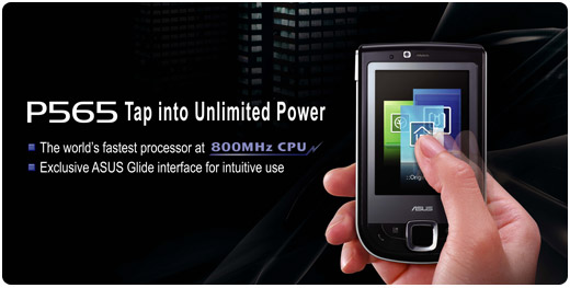 ASUS have officially announced their P565 smartphone, a Windows Mobile 6.1 Pro device the claim to fame of which is an 800MHz processor. According to ASUS, the CPU is good for Vsbenchmark scores near double those of rival handsets. Other specs include a 2.8-inch VGA touchscreen, HSDPA 3.6Mbps, GPS, WiFi b/g and ASUS' own Glide GUI, an interface similar in concept to HTC's TouchFLO 3D.