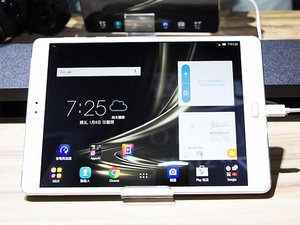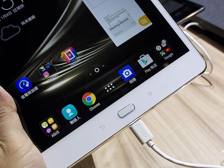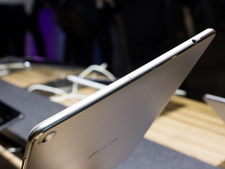 The tablet features an aluminum body, is 5.18 to 7.15mm thick, and weighs 430g. That extra thickness is presumably the bulge around the camera. The rear camera is an 8MP unit with the front camera offering 5MP resolution. The home button also has an integrated fingerprint reader. Asus also fits the tablet with support for the Asus Z Stylus active stylus. The 9.7-inch screen has Asus Tru2Life display technology.