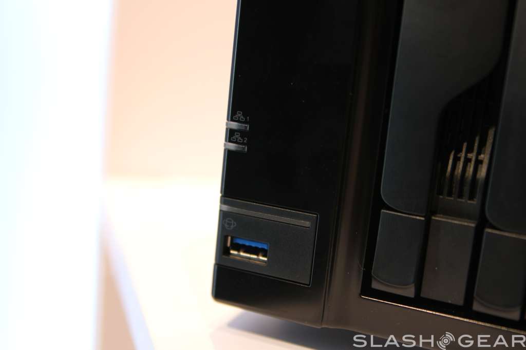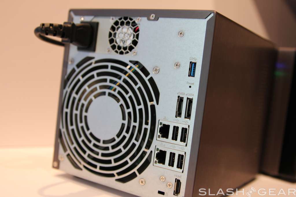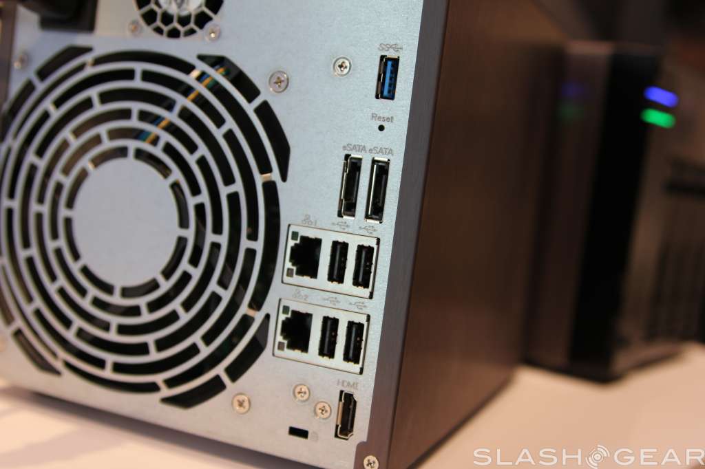 We took a quick peek at the 4-bay model at Computex, which features support for four USB 2.0 ports, two eSATA ports, two Gigabit Ethernet ports, a single USB 3.0 port, and curiously an HDMI port. Presumably any media content that is stored on the NAS can be streamed out via the HDMI port to a TV. There's also a single USB 3.0 port on the front of the device.