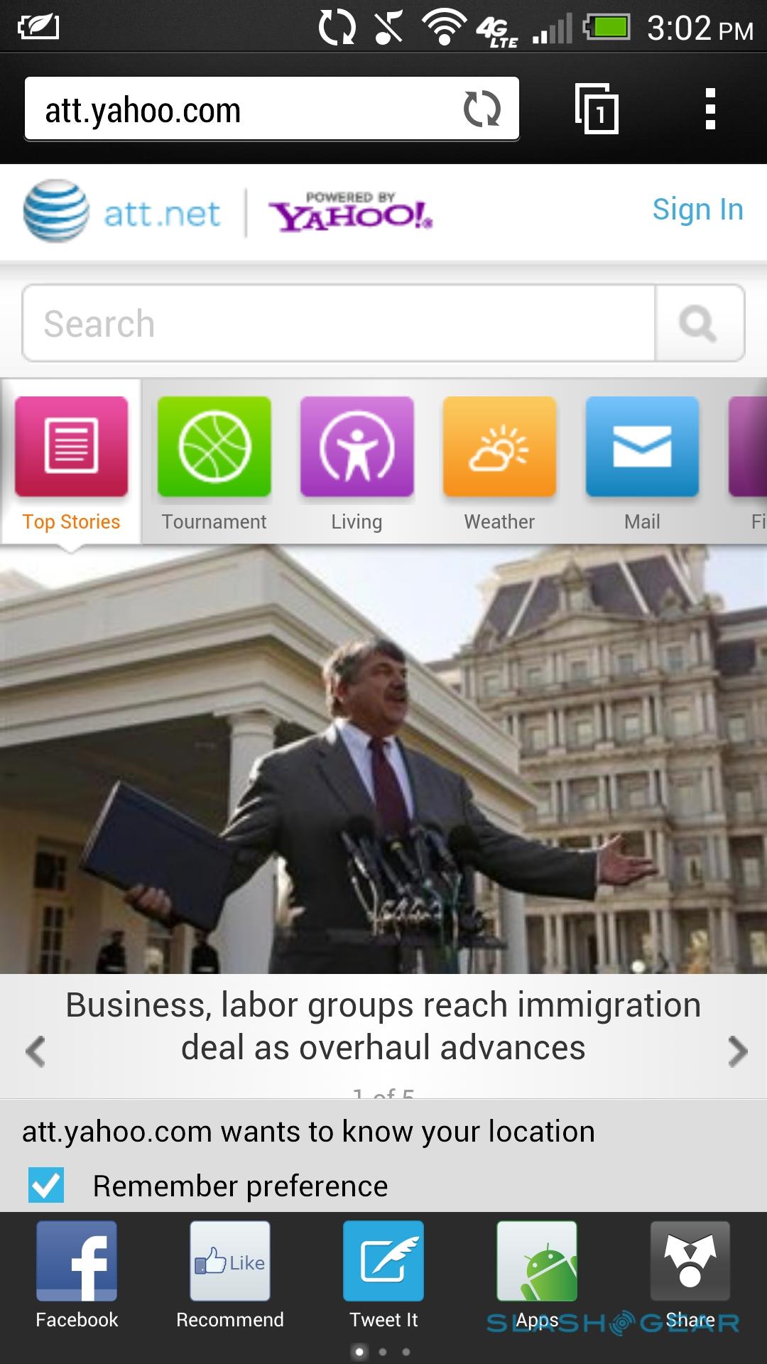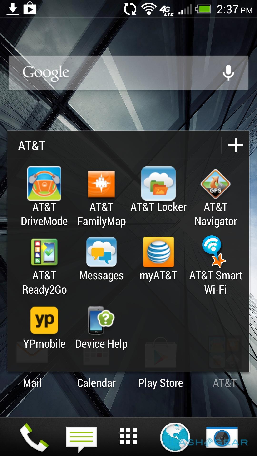 Overall, Sense 5 combined with Android 4.1 performs well, and with the exception of Photosphere we've not really missed anything from the very latest version of Jelly Bean. AT&T's version of the One includes a customized browser, but despite our initial concerns, performance actually improved over the stock phone. In SunSpider, the test of JavaScript performance, the European One scored 1,118.9ms versus the 1,035.1ms of the AT&T version (in SunSpider, faster is better). Overall, we had no issues with the One's quadcore 1.7GHz Snapdragon 600 processor pulling its weight running apps, and even AT&T's preloaded software – which includes DriveMode, Family Map, Locker, Navigator, Ready2Go, Messages, myAT&T, Smart Wi-Fi, YPmobile, and Device Help – are neatly clustered into a folder rather than scattershot across the app launcher.