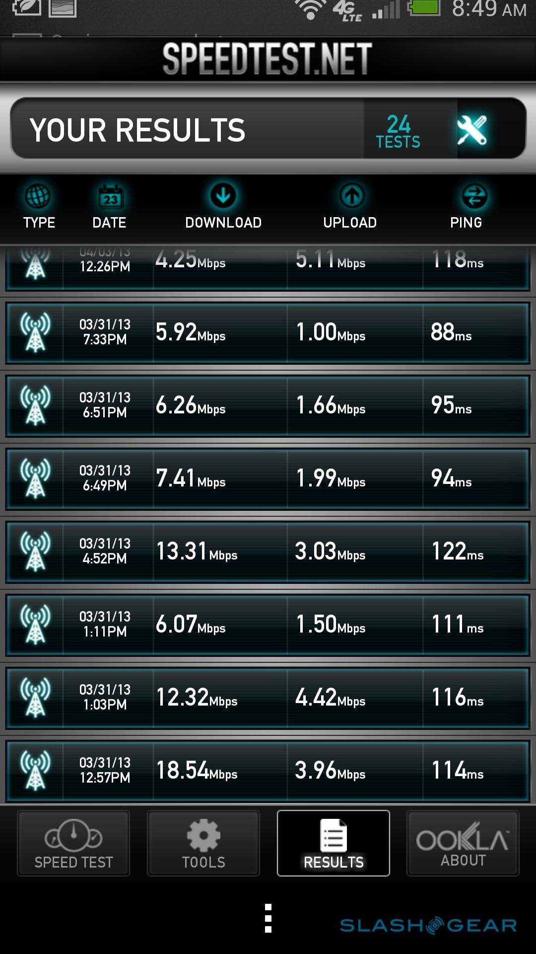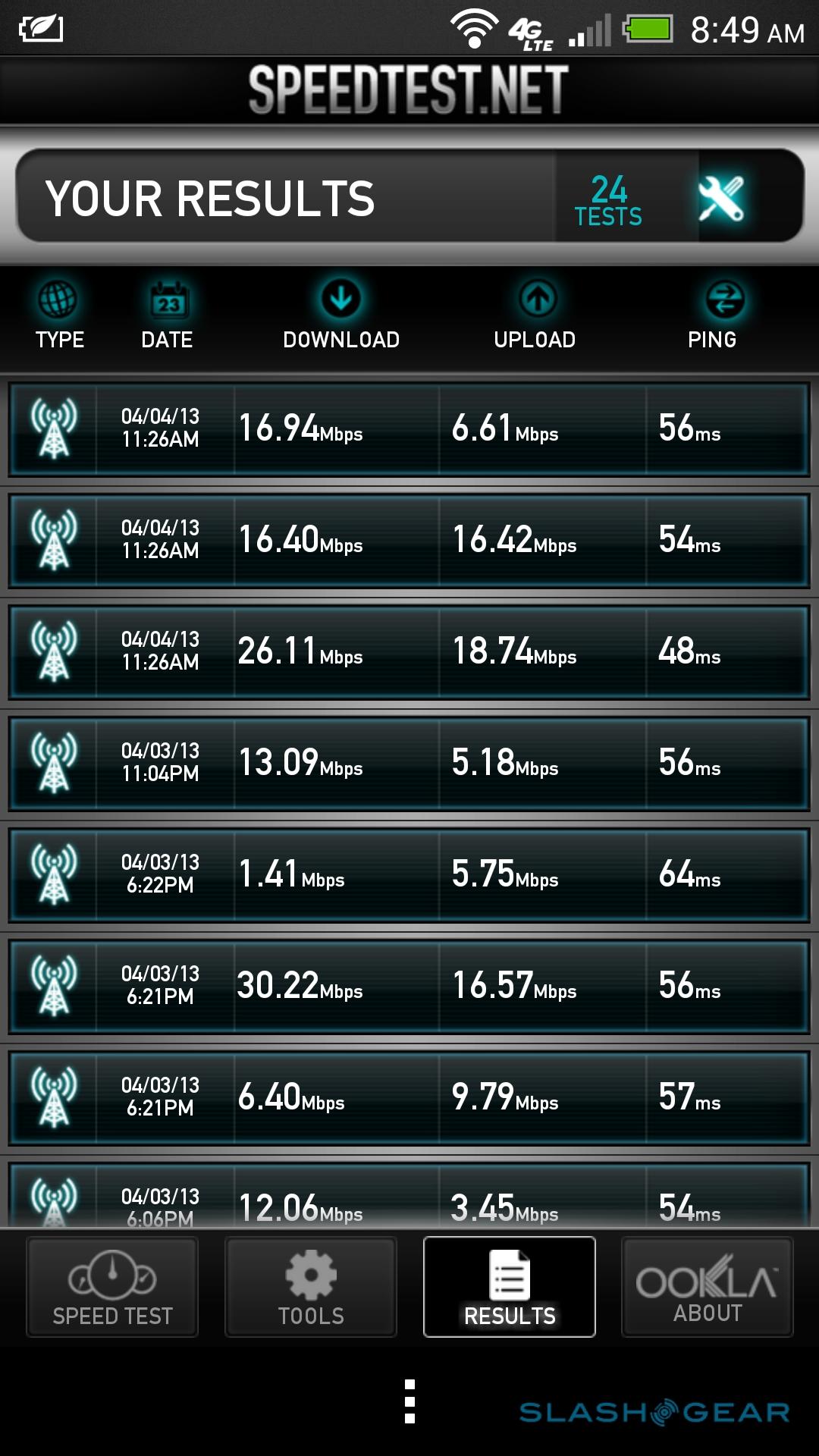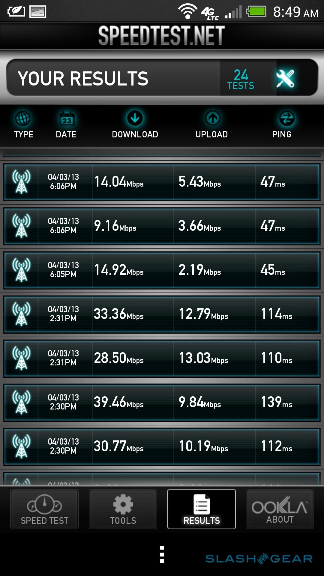 We tested LTE performance in multiple locations where AT&T currently offers service, including New York City, Denver, Wichita, and San Francisco. Speeds ranged from as much as 39Mbps downloads and nearly 19Mbps uploads, location depending, though averaged out at 15.95Mbps down and 7.06Mbps up. In contrast, we saw peeks of 37Mbps down and nearly 11Mbps up on an iPhone 5 using Verizon's LTE network.