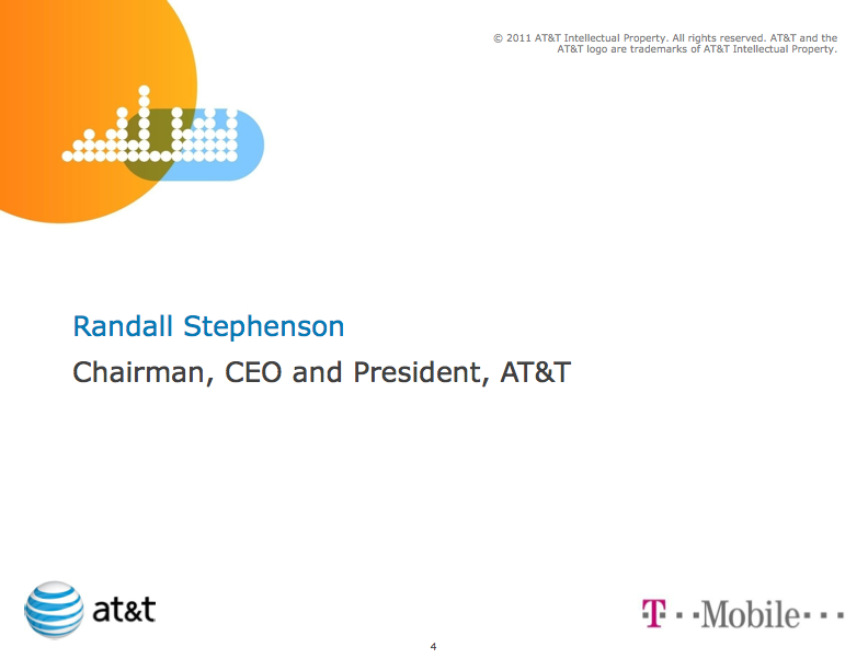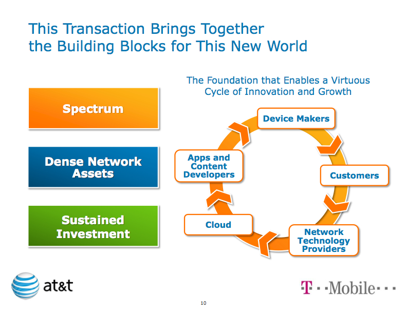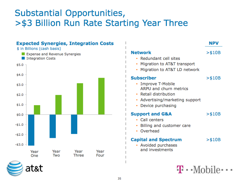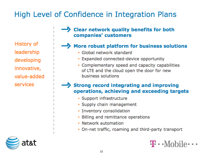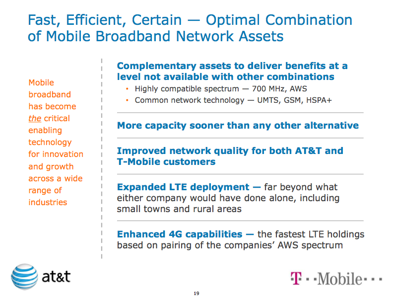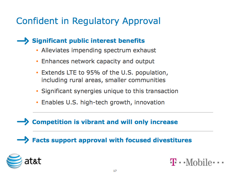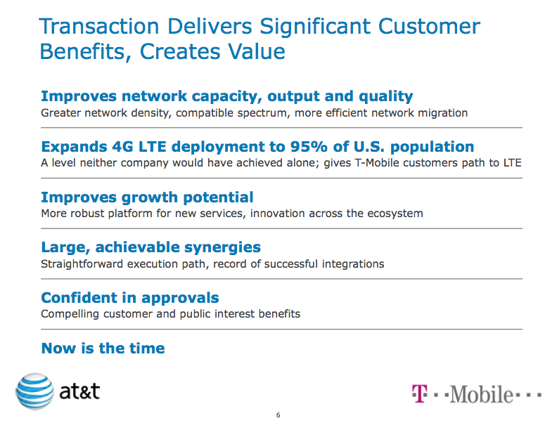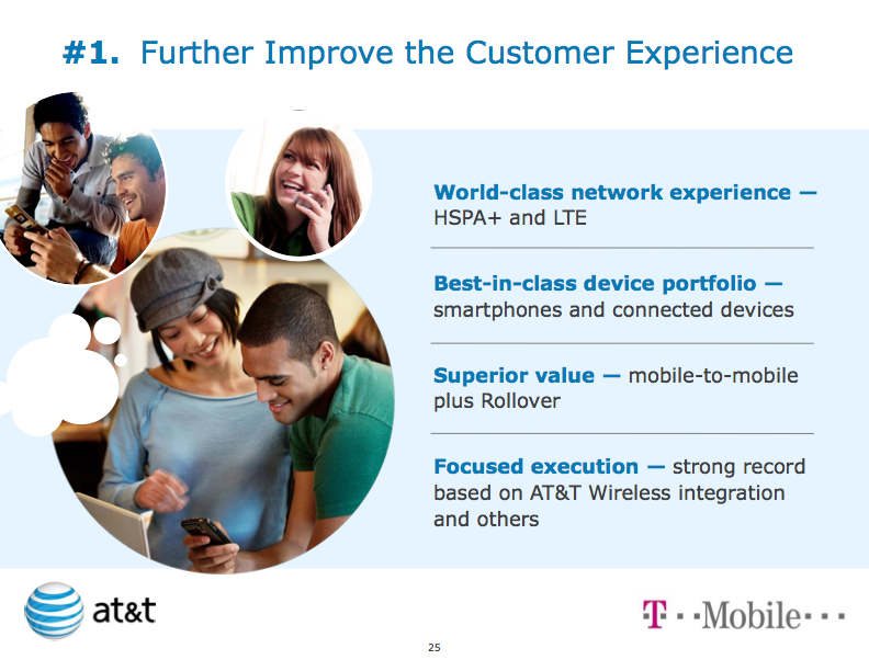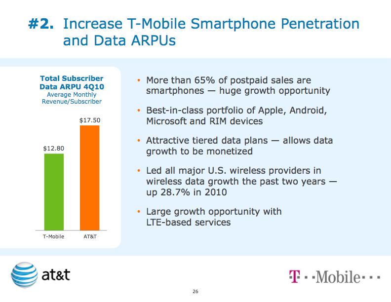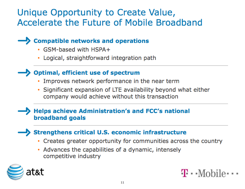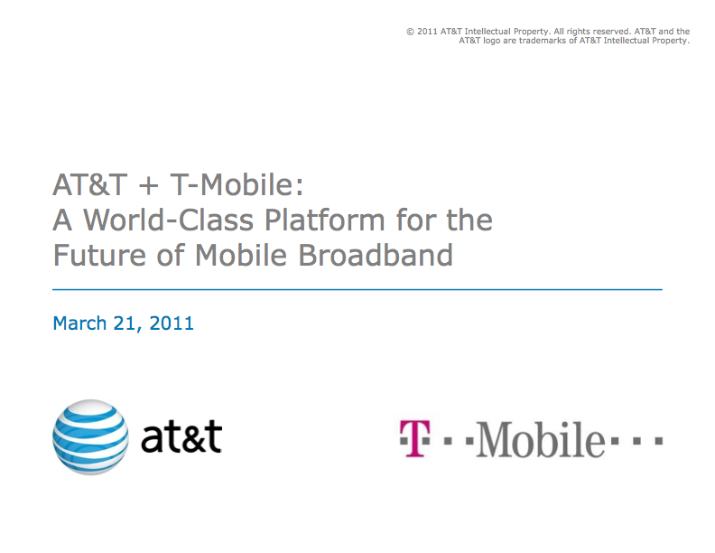 AT&T is doing its utmost this morning to convince investors, regulators and the general public that its proposed acquisition of T-Mobile USA is more than just a good idea for the carrier's shareholders. In the AT&T presentation [pdf link; see gallery after the cut], the carrier promises that AT&T and T-Mobile customers will see benefits within a year of the deal closing; that will include freeing up T-Mobile's 1700MHz AWS spectrum for AT&T to use for LTE roll-out.