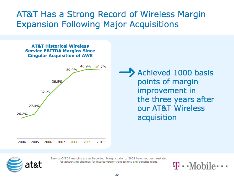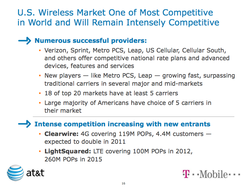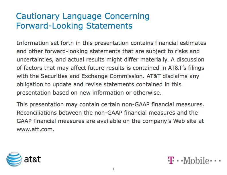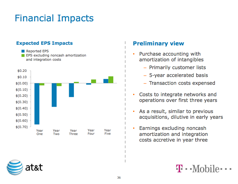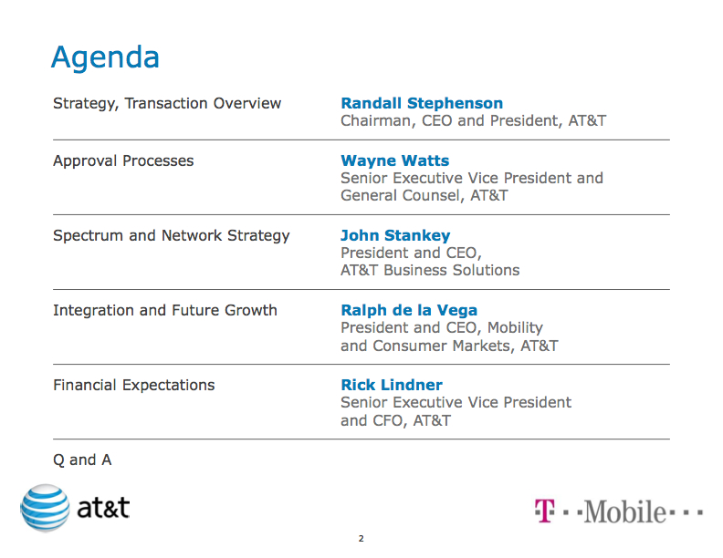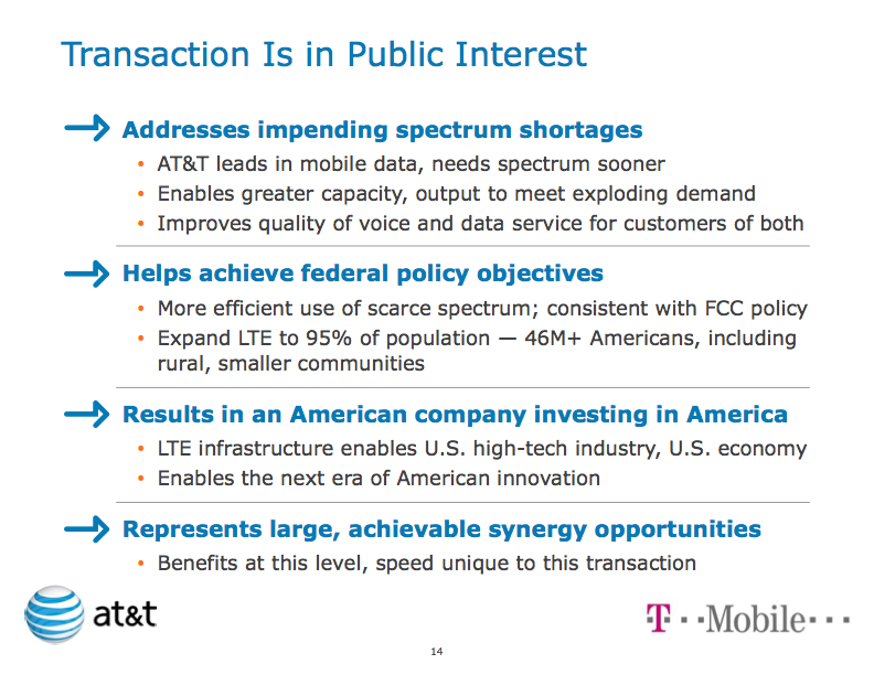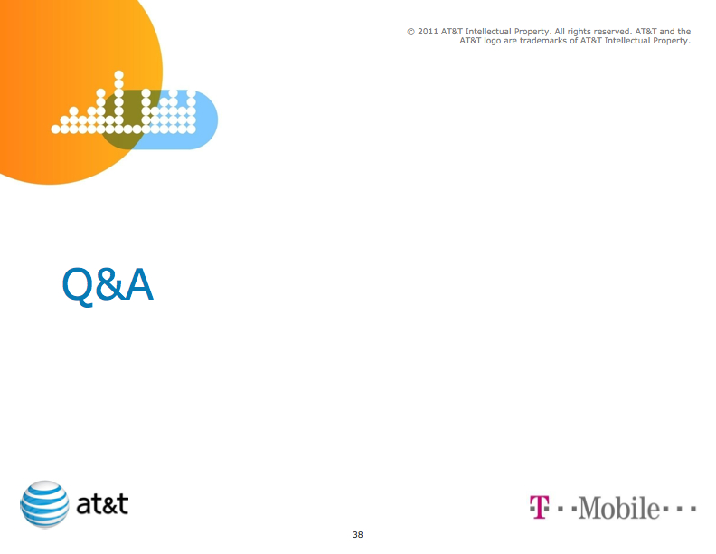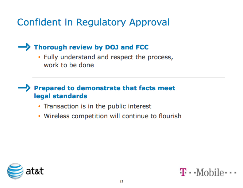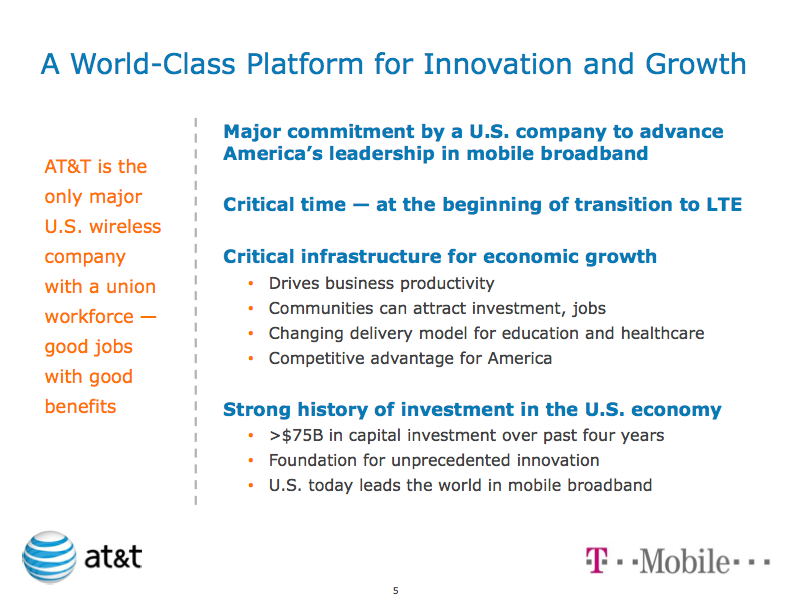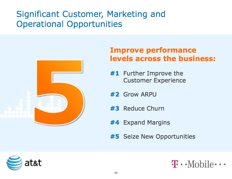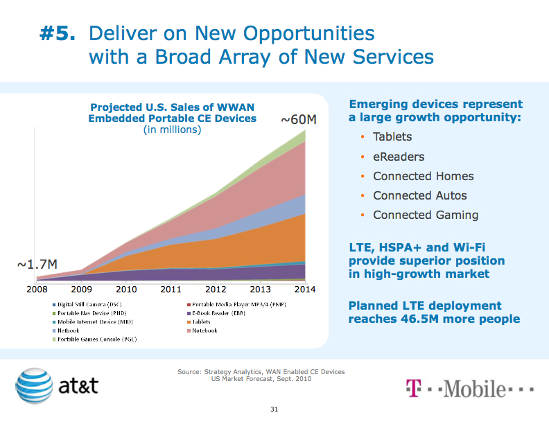 AT&T is doing its utmost this morning to convince investors, regulators and the general public that its proposed acquisition of T-Mobile USA is more than just a good idea for the carrier's shareholders. In the AT&T presentation [pdf link; see gallery after the cut], the carrier promises that AT&T and T-Mobile customers will see benefits within a year of the deal closing; that will include freeing up T-Mobile's 1700MHz AWS spectrum for AT&T to use for LTE roll-out.