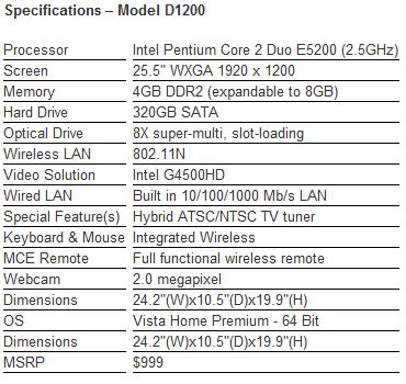 The new 25.5-inch Averatec D1200 AIO features a 2.5GHz Intel Pentium dual-core E5200 processor, 320GB hard drive, 4GB of memory, the 64-bit version of Microsoft Vista Home Premium and integrated wireless keyboard and mouse.