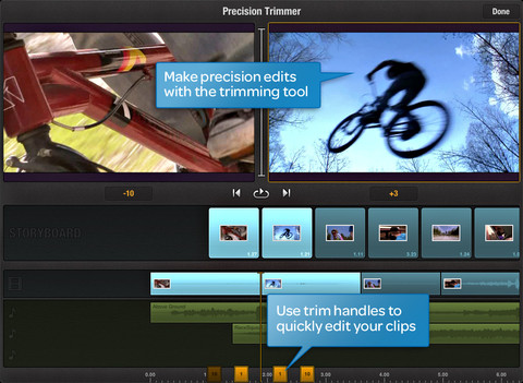 Video and stills can be shot directly within the app itself, and browsed by album, event or face. There's storyboarding support, a "Precision Trimmer" tool and on-the-fly cutting, as well as various fades and dissolves along with picture-in-picture support. Full title, subtitle and credits can be created.