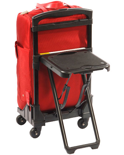 The thing is a carry-on laptop bag that has a wheeled tote that has its own little stool built-in. The seat is pretty cool and can support up to 300 pounds and weighs 6.8 pounds on its own. The carry frame will slip under most airline seats. That would mean you would lose the sport for your personal carry on item though.