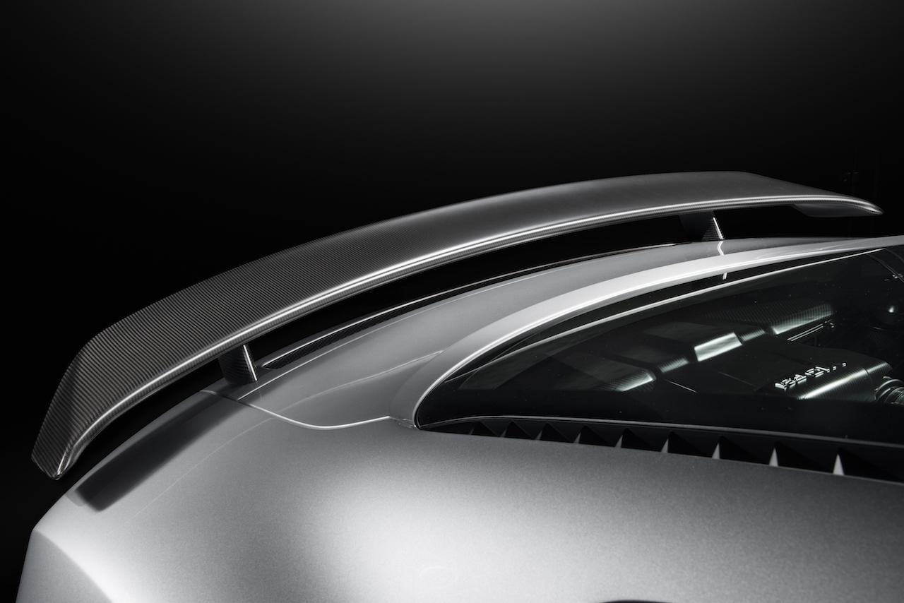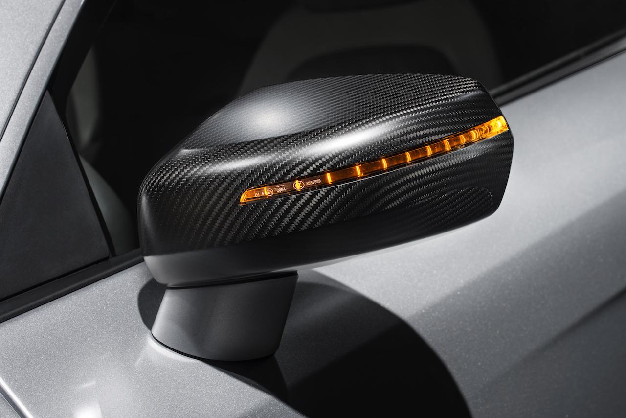 Carbon fiber replaces several elements on the exterior. The fixed rear spoiler, engine bay, mirror housings, flics, side blades, front spoiler, and rear diffusor are all finished in the eye-catching material, but which also helps save weight.