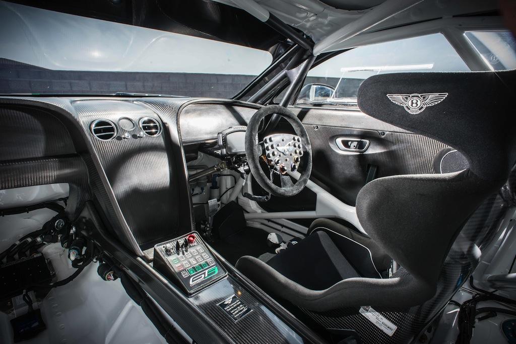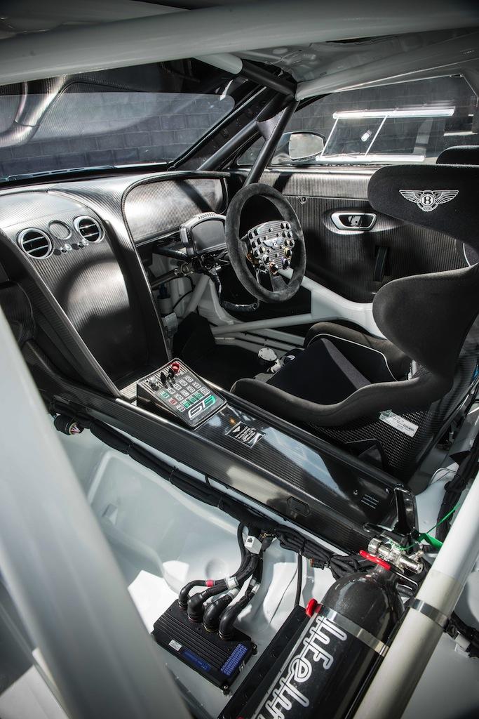 Although the external design shows the obvious relation to Bentley's Continental GT road car, there have been some major changes to fettle it for the track. In total, Bentley has ditched more than 1,000 kg in weight, including the wood and leather interior trim, the electrical systems usually found in the production car, and most of the controls on the dashboard. That brings it under 1,300 kg, even with the addition of some carbon-fiber on the outside: a rear wing, a splitter at the front, and tweaks to the bonnet, bumpers, fenders, and sills to cut drag and increase passive cooling.