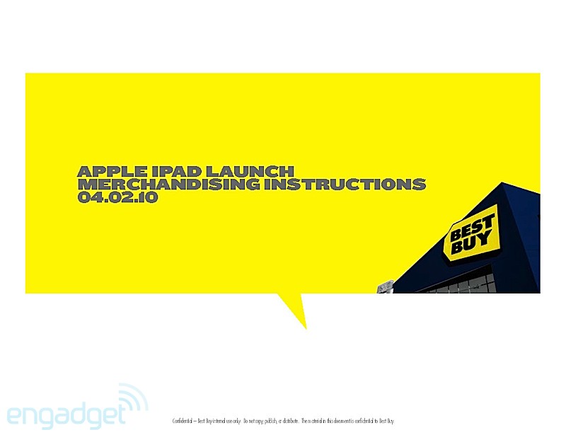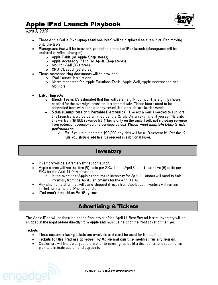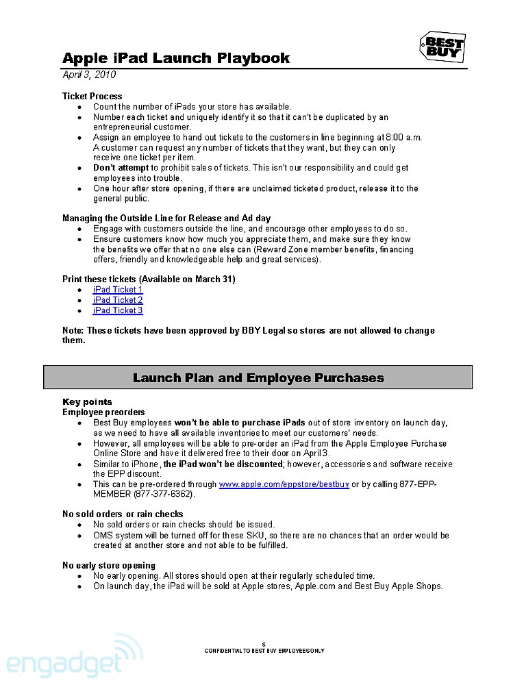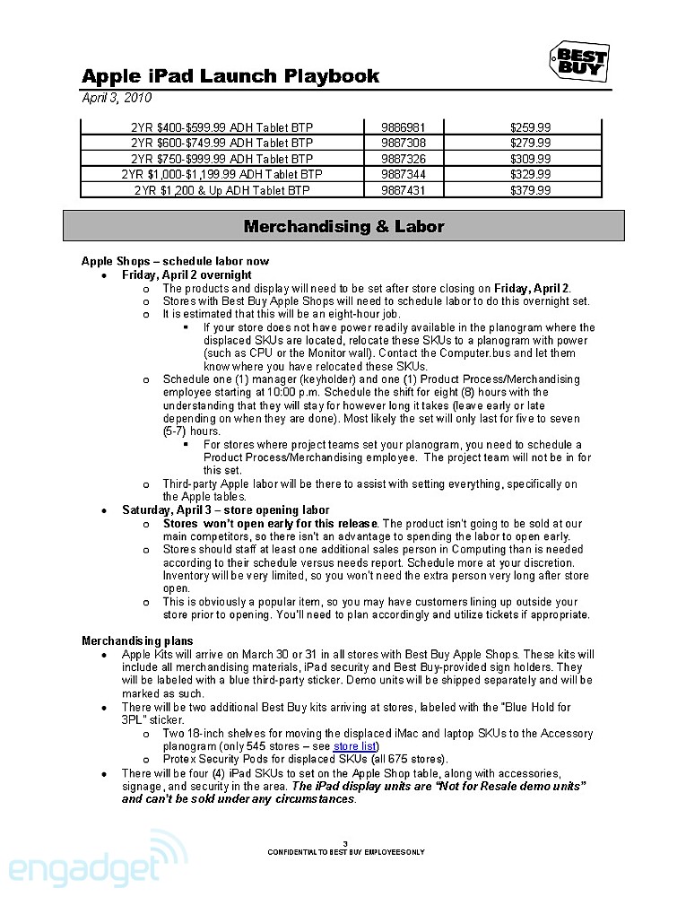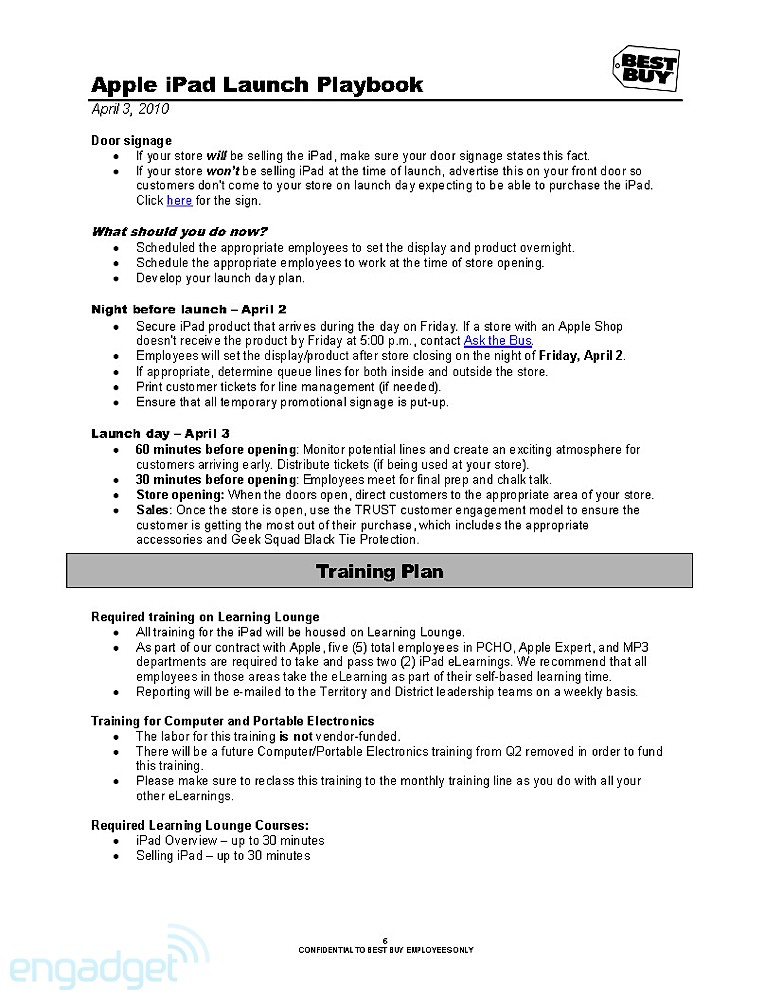 They're doing the normal routine, especially for a launch that Apple usually dictates. The playbook details how managers, as well as employees, should handle themselves throughout the day. It even breaks down how the set-up should go about the night before, when Best Buys will erect iPad-specific parts of the stores. As the playbook dictates, that should take about 8 hours, so Best Buy employees are going to need to drink a lot of coffee. Of course, we'll enjoy their hard work by staring at it while we wait in line.
